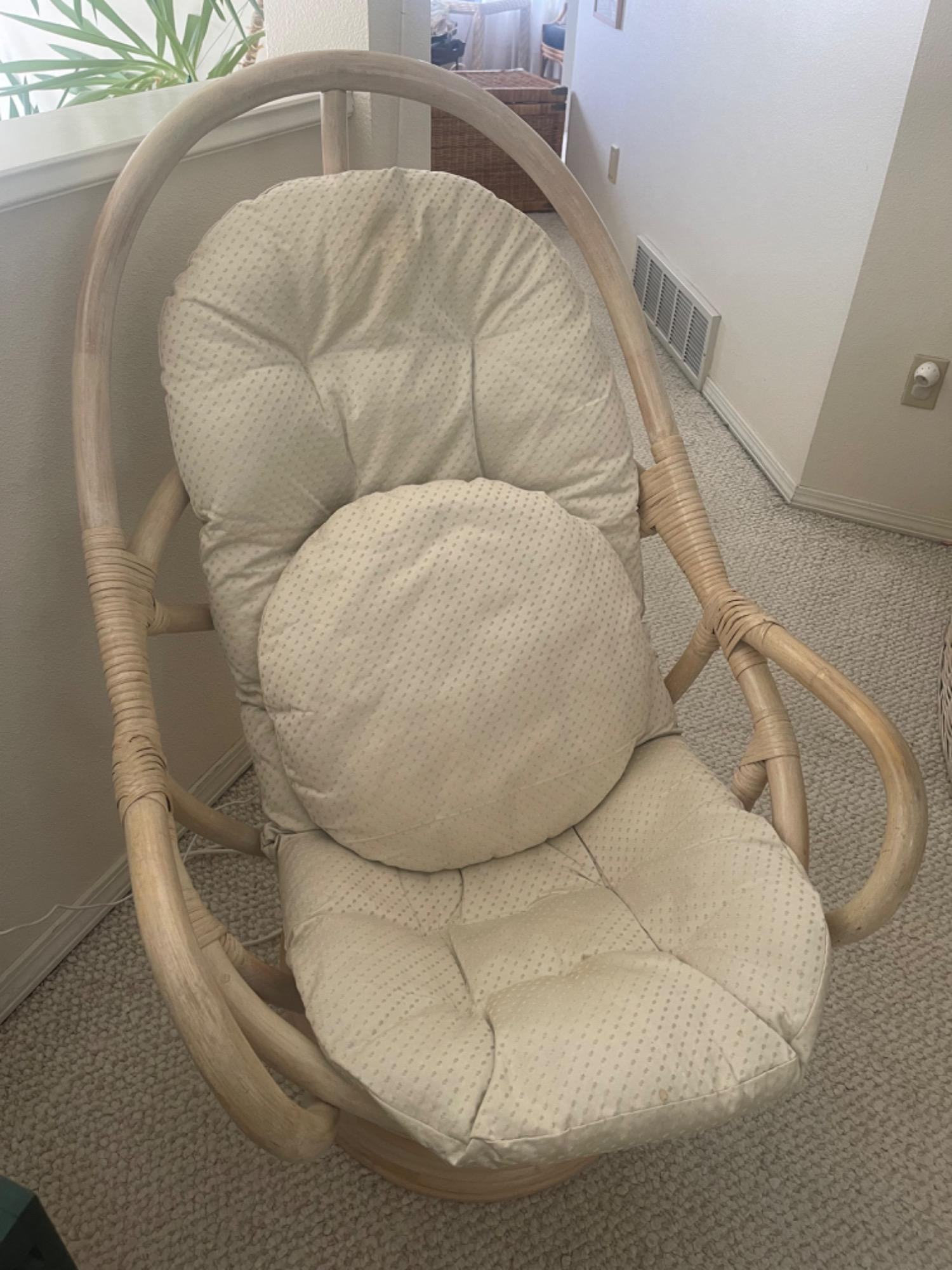 Measurements: 28.5 inches x 27 inches x 41.5 inches Cushion has some staining. Chair looks to be faded in is in good condition. Bidding on this lot is an agreement that: (1.) You
