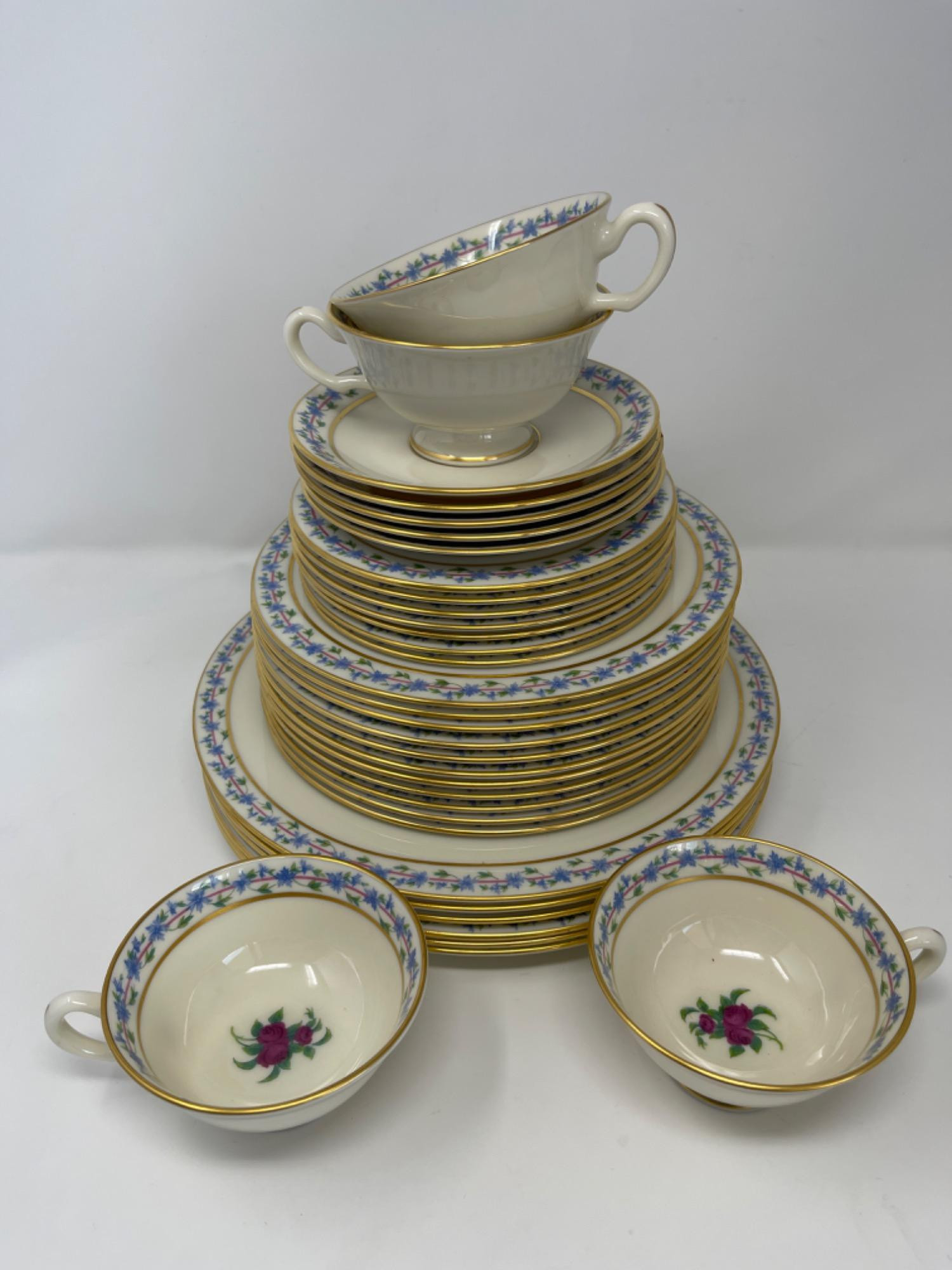 (11) Salad Plates: 8.25 inches wide (6) Dinner Plates: 10.5 inches wide (5) Saucers: 5.5 inches wide (4) Teacups: 4 inches x 2 inches There is some wear to designs on china, but no big chips. Great condition.