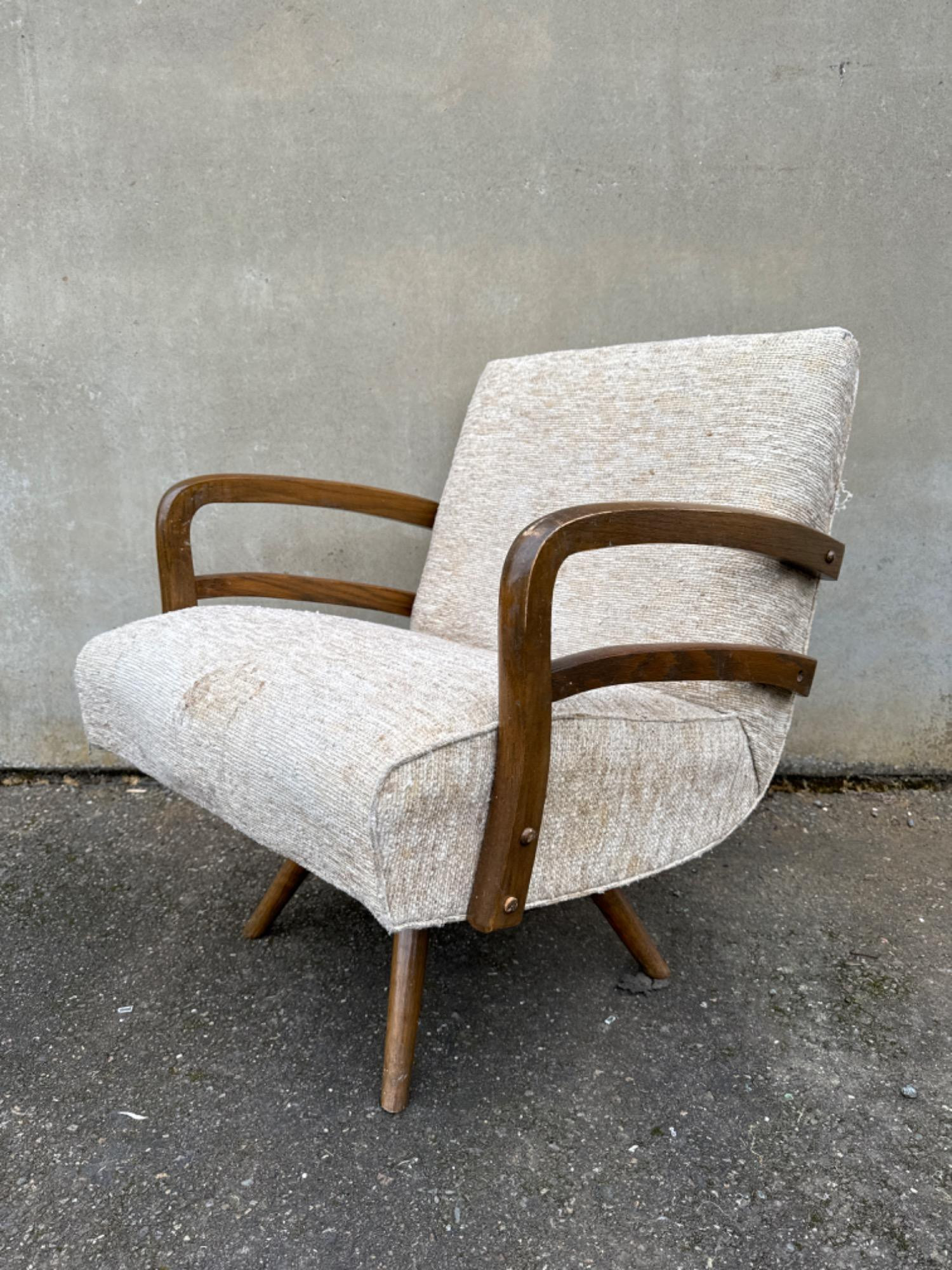 Mid Century Taupe & Ivory Swivel Rocker Chair Needs cleaning, has marks on fabric and something on right outer arm. Chair is comfortable with great bounce and swivel. Measure 30"T x 30"D x 26"W x 18" seat height