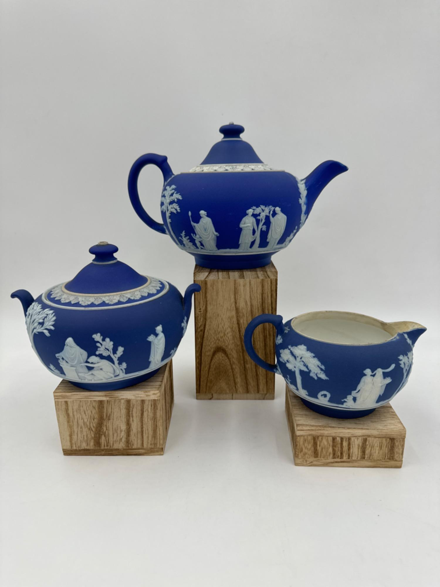 Lot # 12 - Wedgwood Dark Blue Jasperware Teapot, Creamer & Sugar