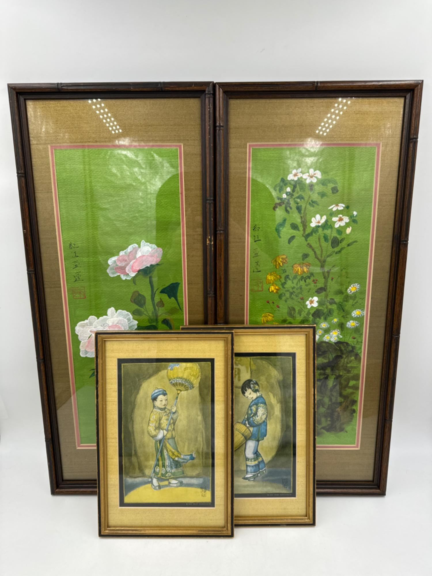 1925 Wylog Fong reproductions - wear to edges of the frames - overall good condition. Frames measure: 11.75 x 7.75 Floral Asian original paintings in bamboo shaped wood frames - minor wear to frames Frames measure: 10.5 x 24” measurements of the frames.
