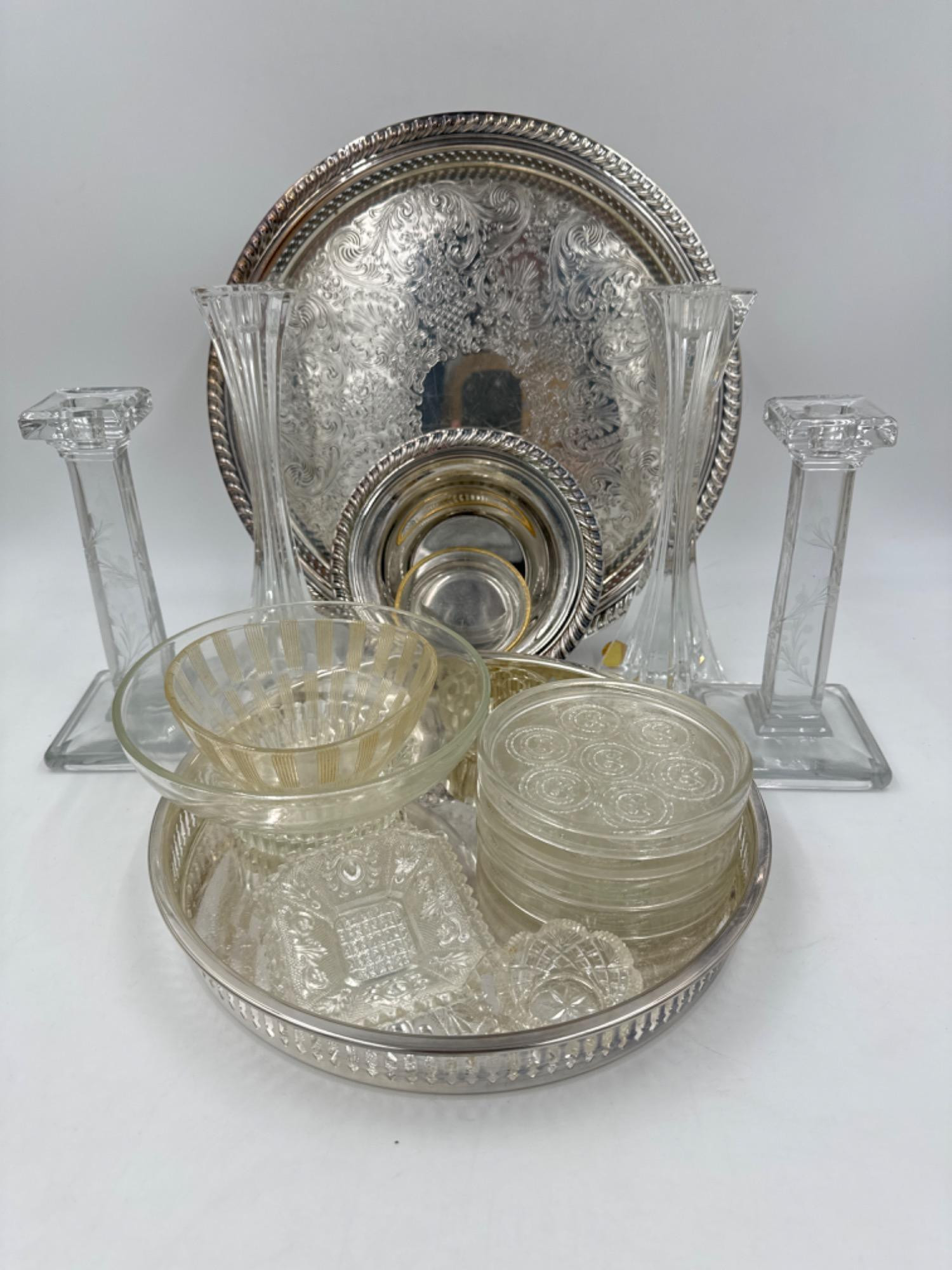 Vintage Silver Plate, Crystal, & Glass Table Decor Crystal candlesticks 9"T & Etched glass candlesticks 7.5" - both great condition Largest silver plate tray is 12.25"D All the glass appears to be in good condition