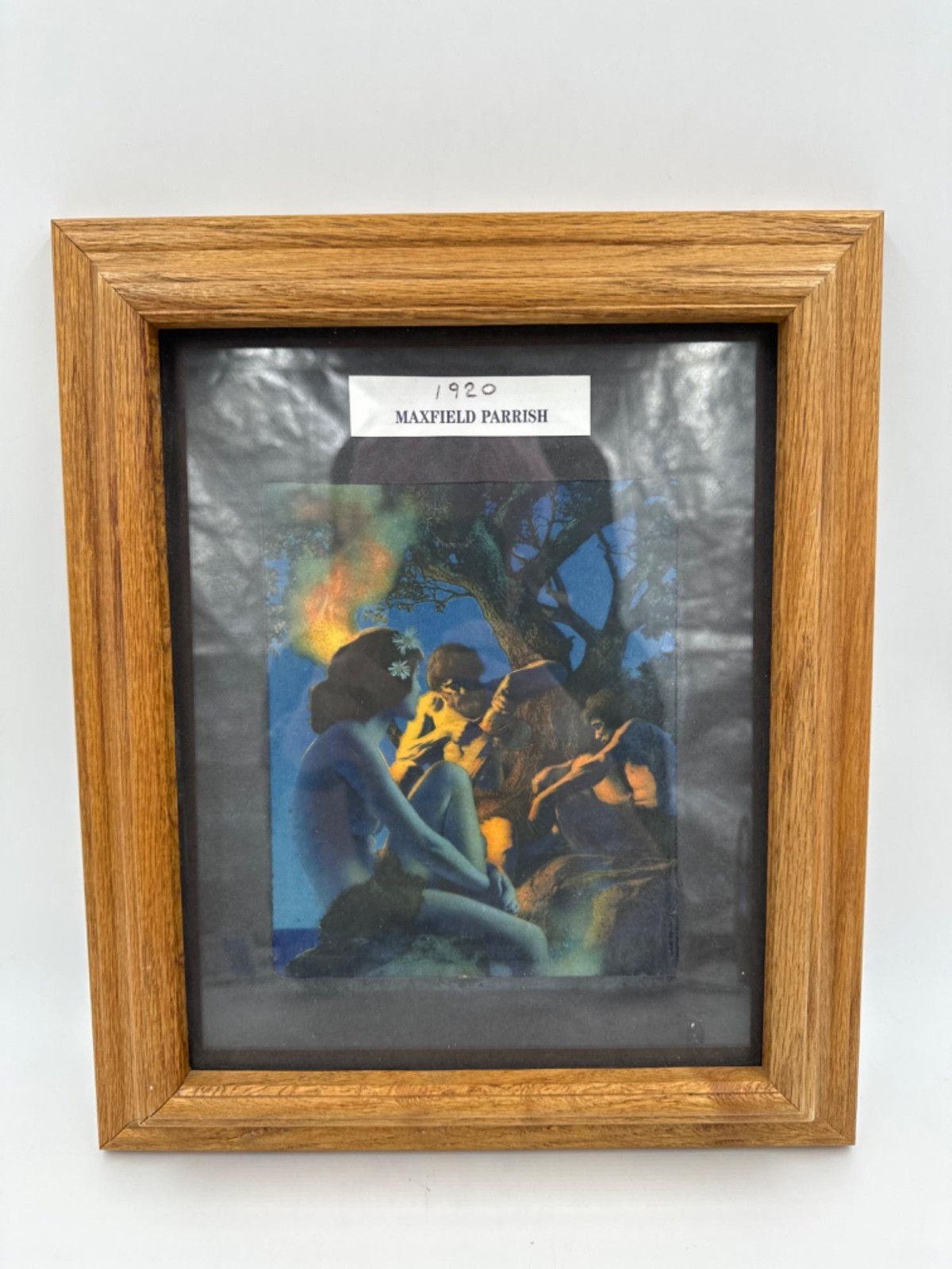 Antique Vintage Maxfield Parrish 'Primitive Man' Framed Print Print had been cut down. Colors are still vibrant Frame measures: 11 x 12.75"