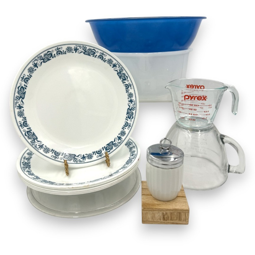 Pyrex 328 Rainbow Blue Mixing bowl - 4 L - wear blue on the exterior and utensil marks Glasbake for Sunbeam number 21 mixing bowl - handle to handle 9.75 inches (4)Corelle Old Town 10 1/8" dinner plates Pyrex 9 inch dish & 1 cup measuring cup 4 Cup Pampered Chef measuring cup and Lillian Vernon egg coddler