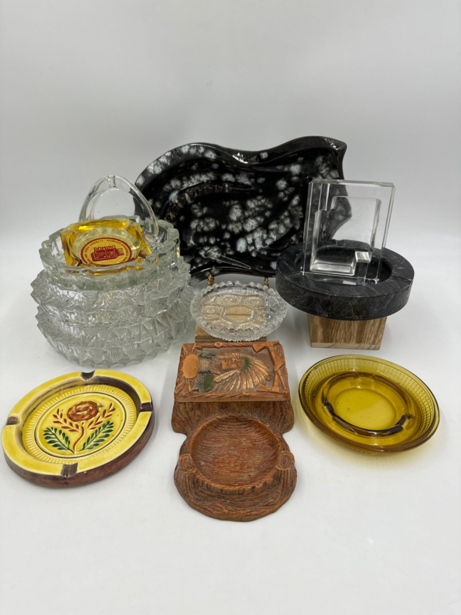 No Butts About it - Vintage Ashtray Collection Drip glaze ceramic ashtray - 11.25"L - 2 minor flea bites 1950s Resin faux wood ashtray trinket dish Amber glass Domino Club ashtray, there is a chip on the bottom side Smallest ashtray is approximately 3.5"W Largest (excluding the ceramic) is 7.5 inches.