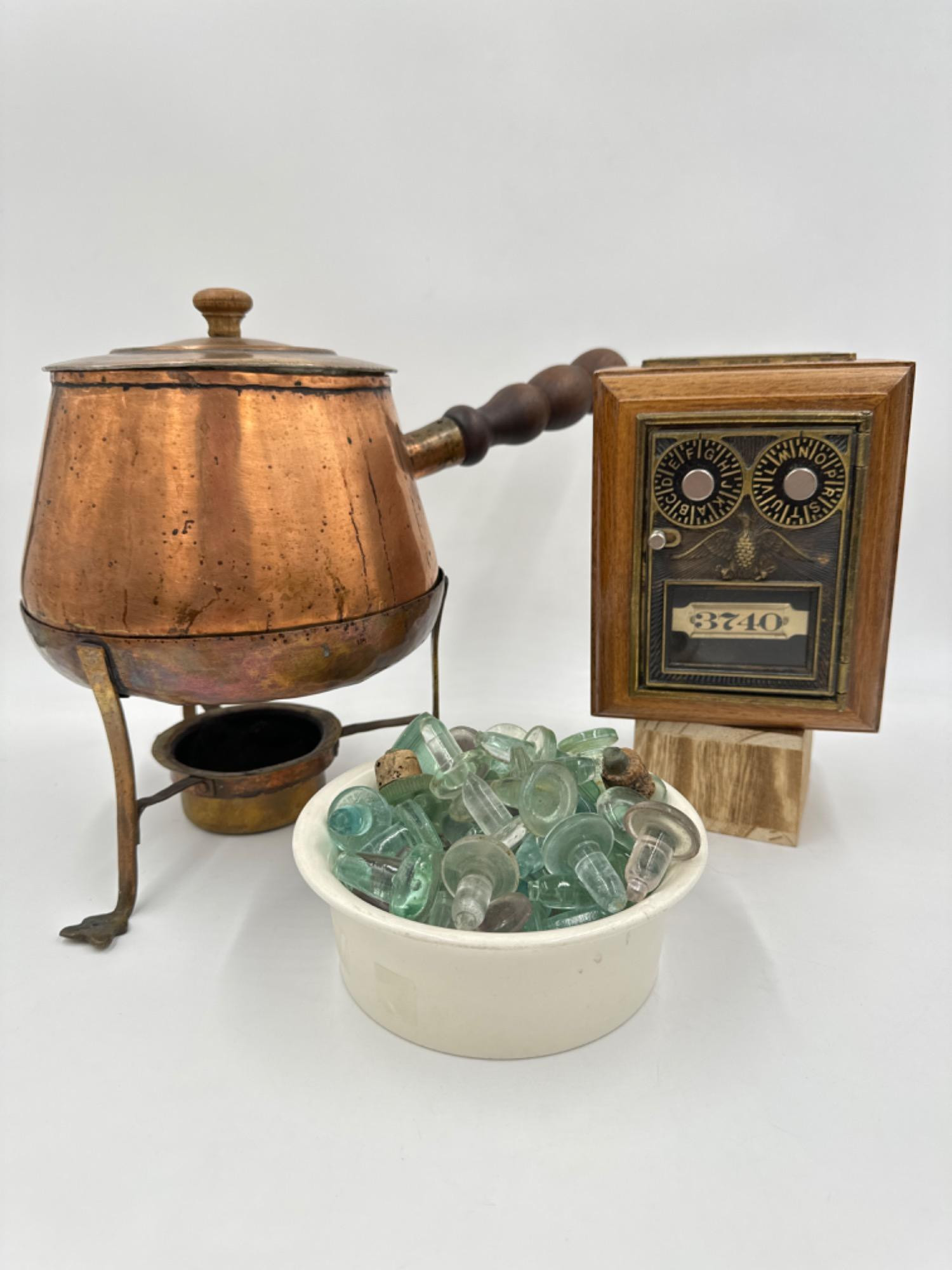 Vintage & Antique Peshawar Copper Pot, Mailbox & Glass Bottle Stoppers Large collection of vintage & antique glass bottle stoppers Copper pot top of lid 11 inches tall Antique Vintage Post Office Lock Box Coin Bank #3740 Olde Tyme Reproductions Measures: 6.5 x 5.25 x 5.75” deep