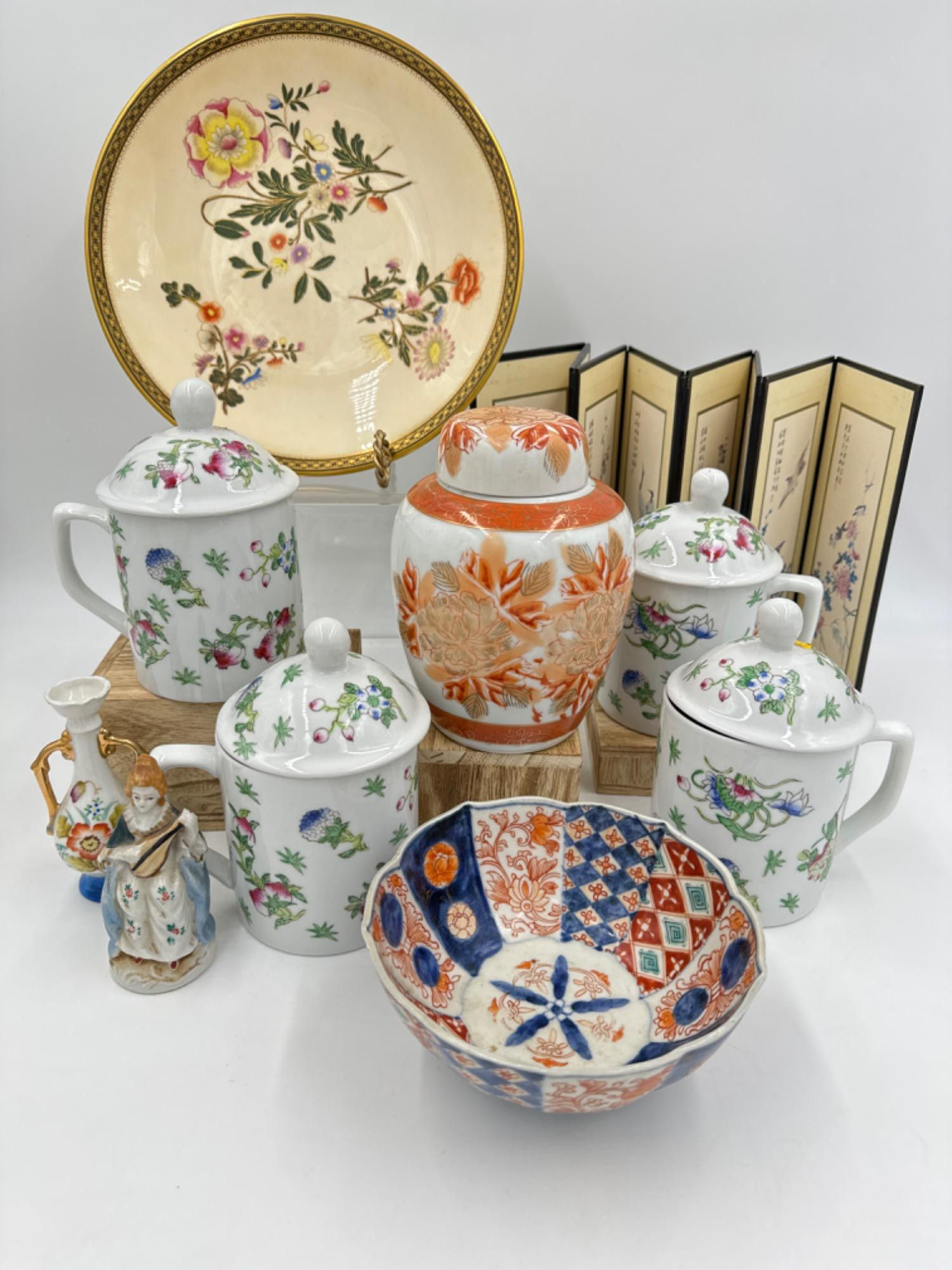 Vintage Asian inspired goods includes: Seven panel mini screen - 8.25 inches tall (4) New covered tea mugs Hand Painted plate W/773 - 9 1/8 inch (2) Made in occupied Japan ceramics. Woman with instrument has damage. and more!