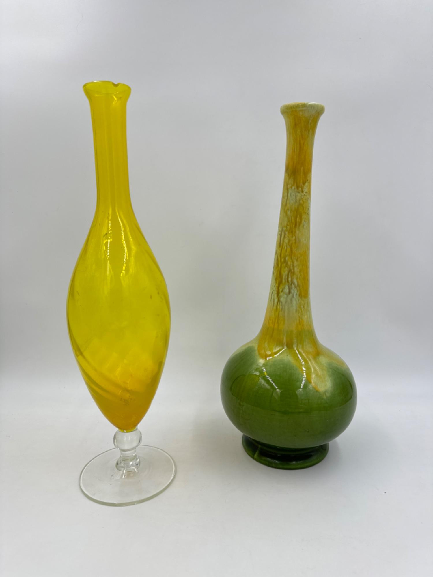 Haeger ceramic drip glaze green and yellow with a dash of brown vase - 15"T Has crazing Yellow pedestal swirl glass ewer vase spout - 16"T - Missing stopper Both are in good condition - needs to be cleaned