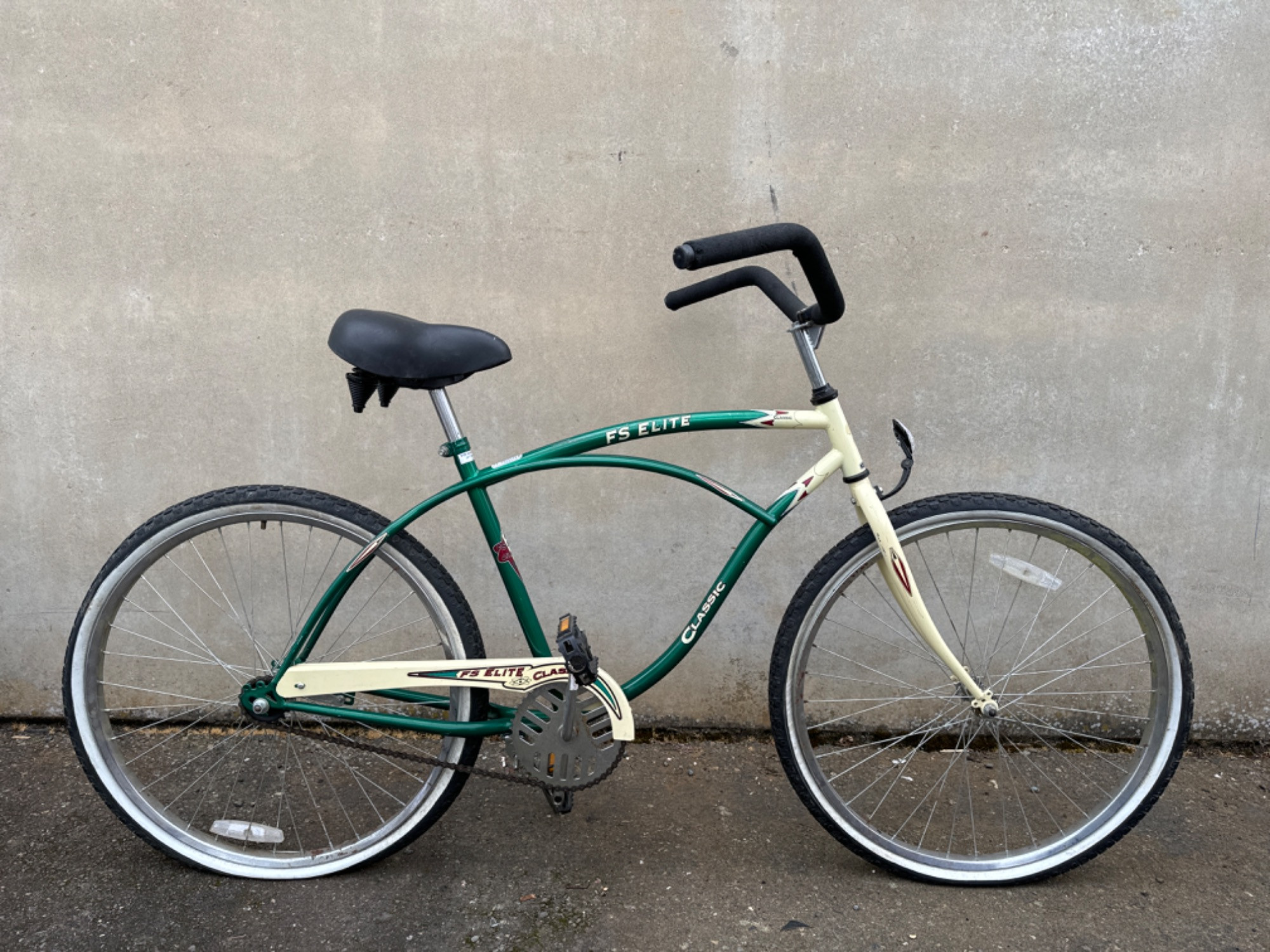 Green & Ivory ES Elite Classic Beach Cruiser Bike Surface rust on rims - 26 inch tires Damage to foam on handlebars Needs new tubes/tires