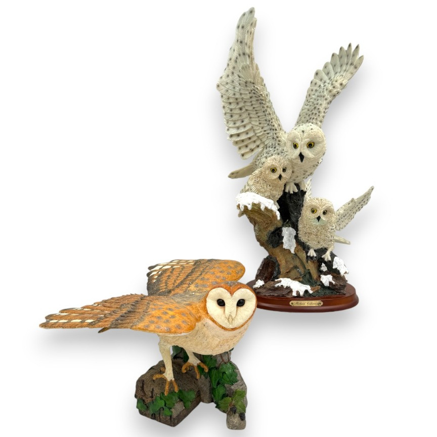 Michael Collection Owl Statue - Made of composite material - 17"T A. Richmond The Grey Rock Collection Barn Owl Statue - Heavier, chalk? material - approximately 8.5"T x head to feathers 13” x 12” wingspan.