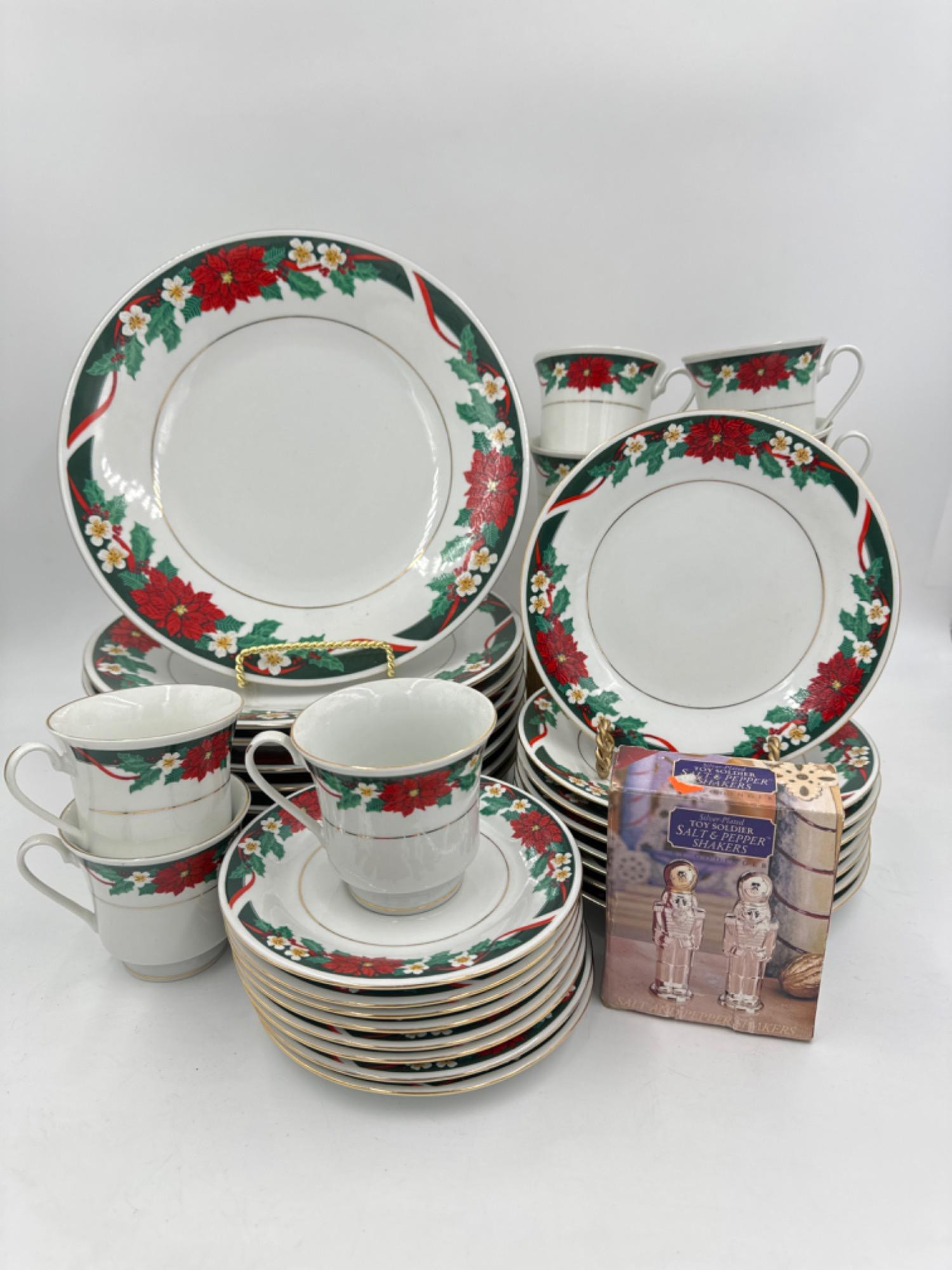 Tienshan Deck the Halls Poinsettia Christmas Dinnerware - 8 Settings All appear to be in excellent condition Also comes with Silverplate Toy Soldier Salt and Pepper shakers