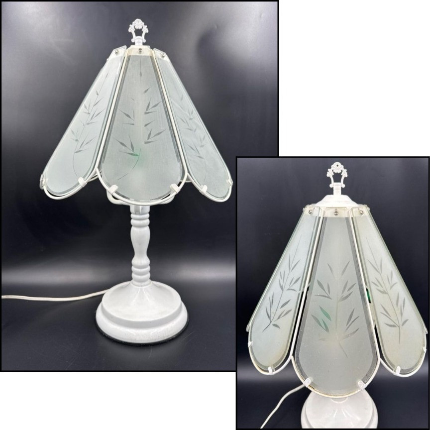 Vintage Accent White Lamps w/ Bamboos Glass Shades One panel of the bamboo glass is chipped. Very dirty both me cleaning. Measures 22"T x 13.5"D shade diameter Both work great and have fun green bulbs!