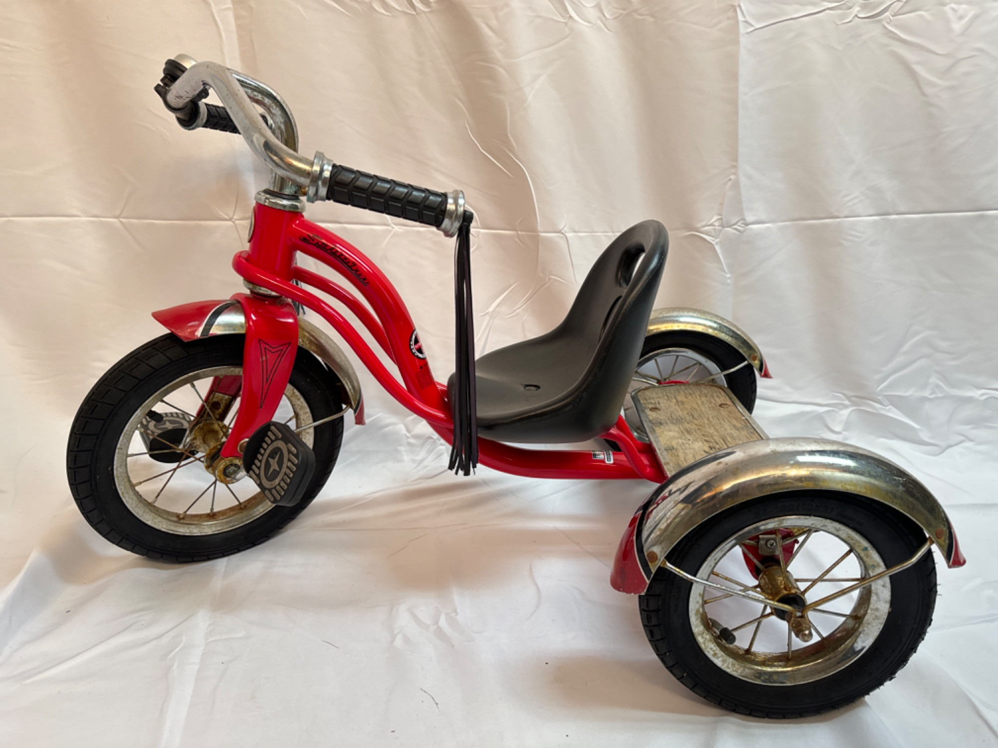 Red Schwinn Roadster Tricycle Tires are flat, has surface rust on the chrome parts. Seat is cracked where it is bolted to frame.