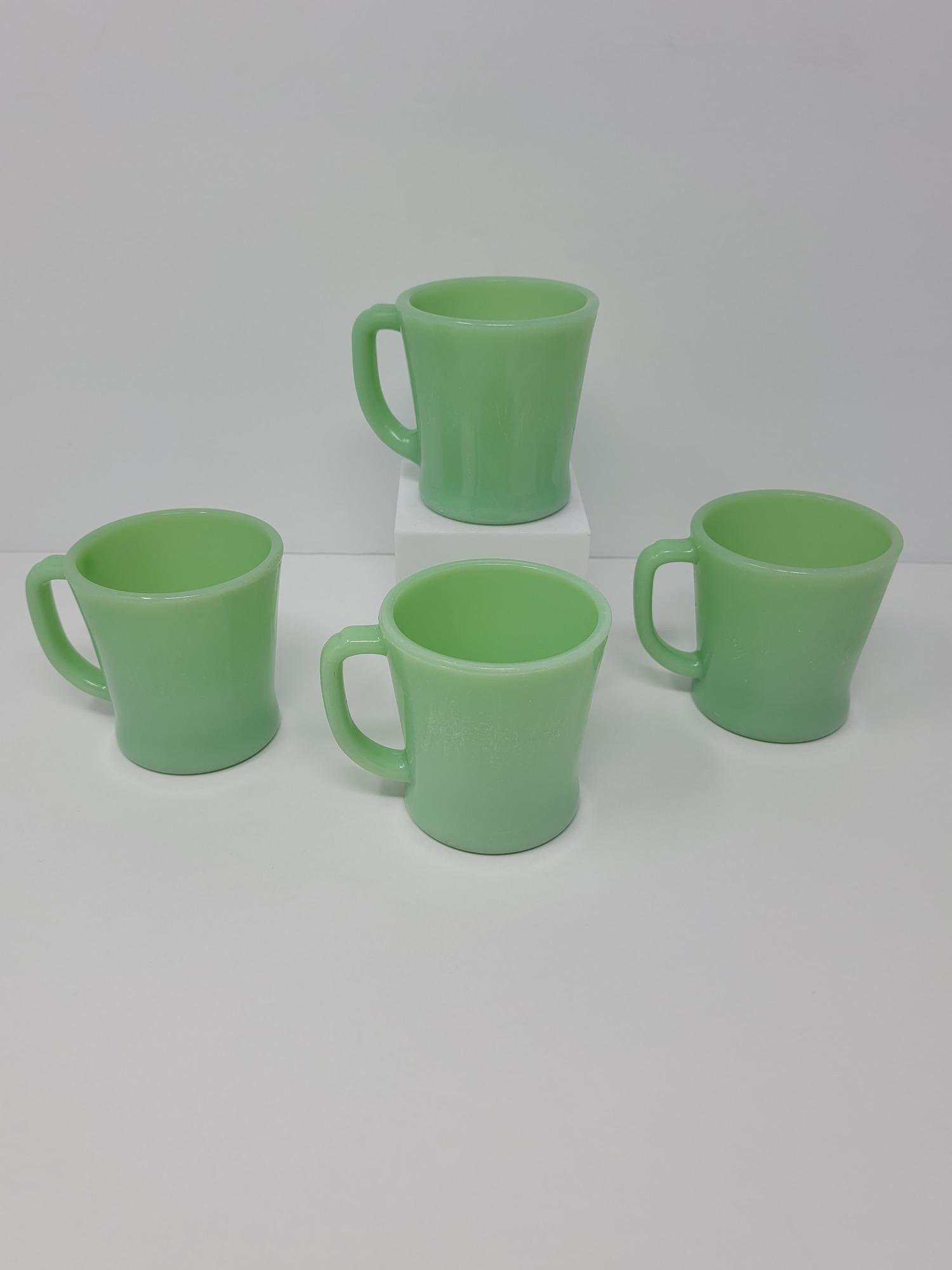 Jadeite "D" handled Fire King Oven Ware Cups (4) Each cup measures 4" (including handle) x 3.5"