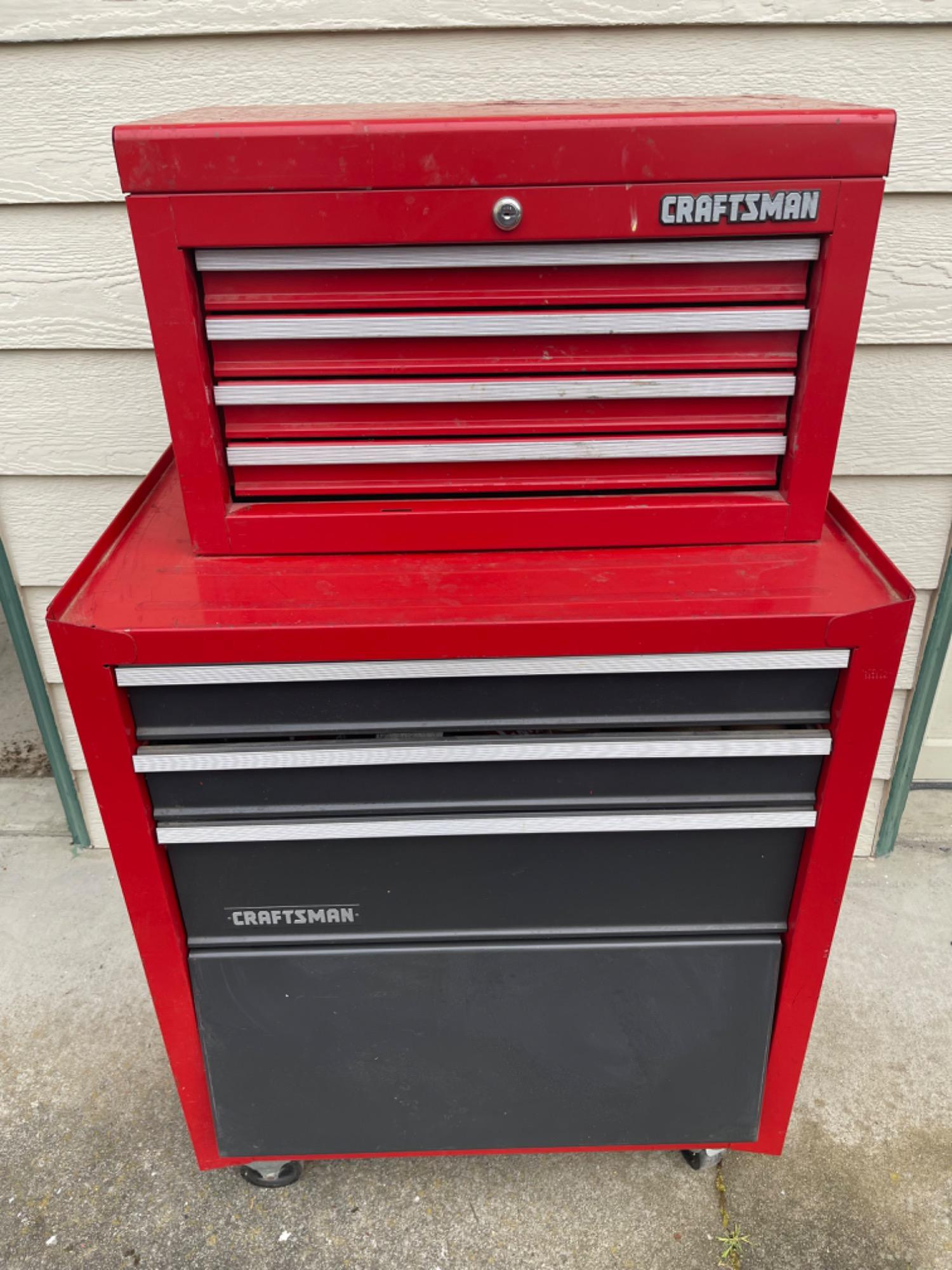 Husky rolling tool chest filled with a plethora of tools. Chest is 26.5 W x 46 T x 18 D Keys are included.