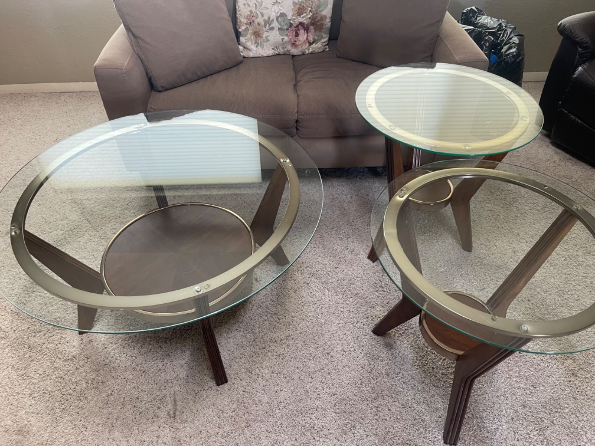 Beveled thick glass top tables, manufactured wood base with a touch of brass look accents. Coffee Table measures- 37" D x 20 T Matching Side tables- 23.5 x 24 T