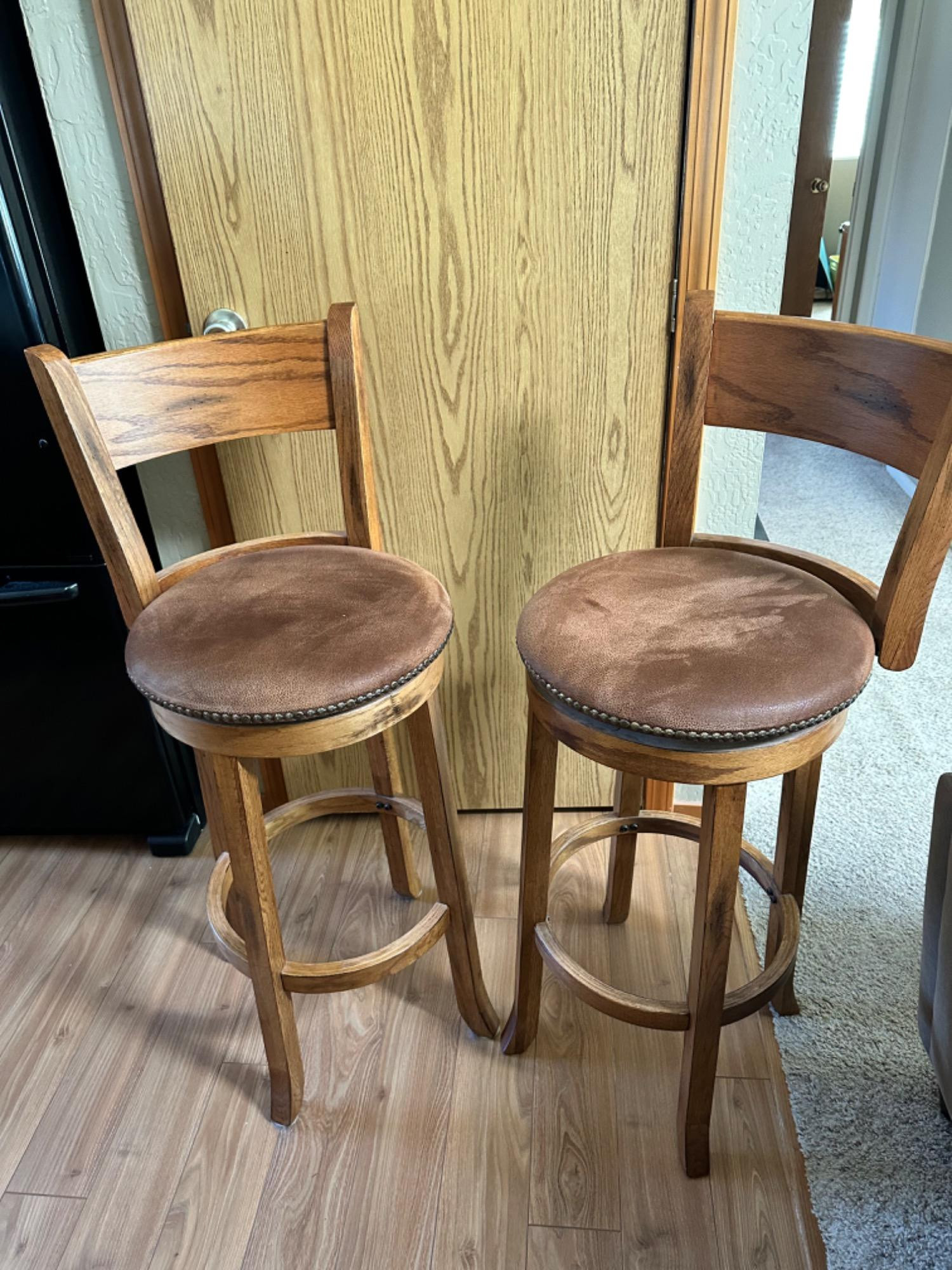 Stool seat height- 30.5 (to top of chair back 43.5) Chair width 17" microfiber seat, appear to be oak. Good condition.