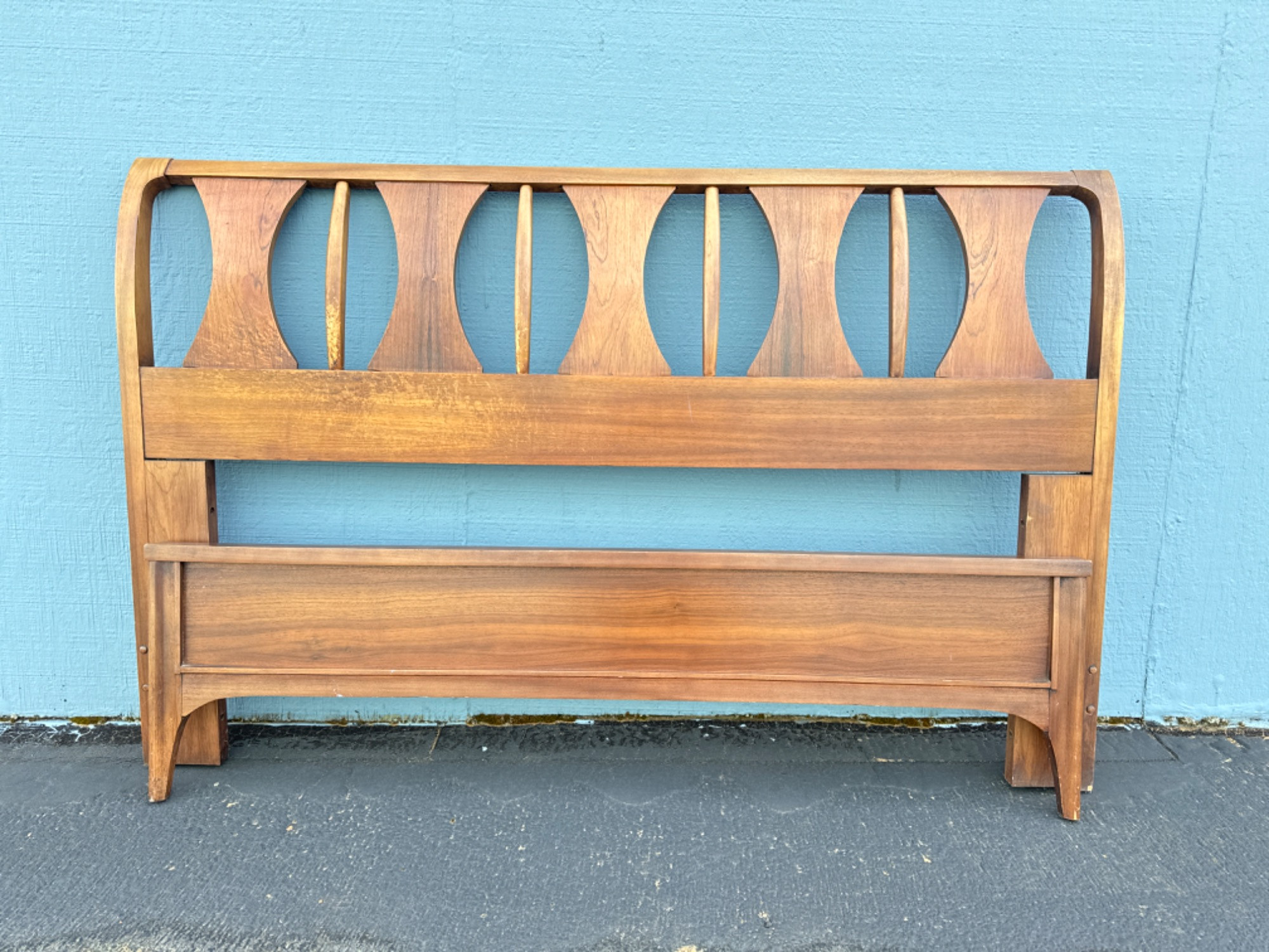 MCM Kent Coffey Perspecta Rosewood & Elm Full Bed Frame Headboard Measures: 60"W x 38.5"T Footboard Measures: 56"W x 15.5"T Has wear to the left side of headboard surface Nick to edge of baseboard. Rails have been found, not pictured.