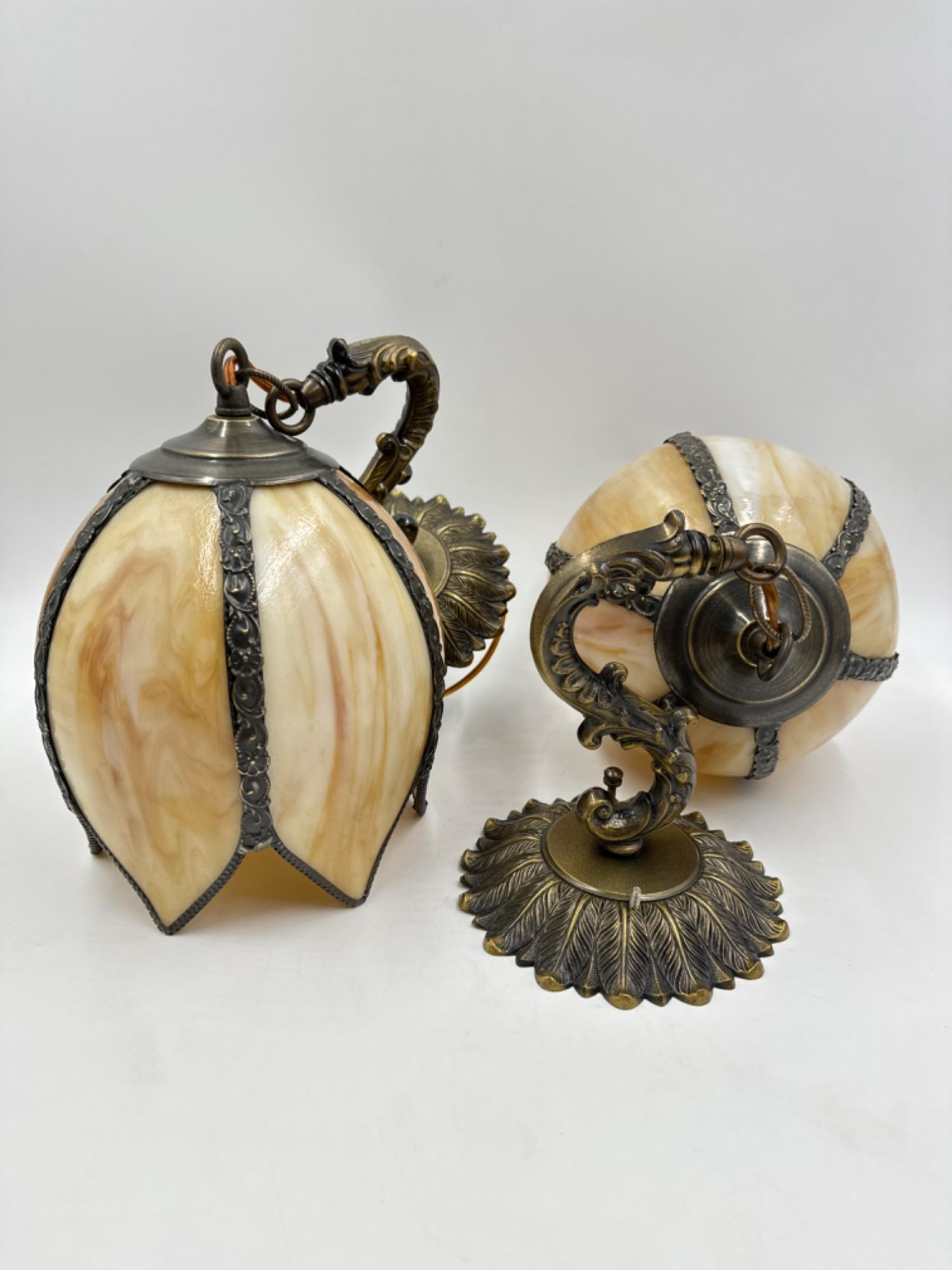 Hollywood Regency Slag Glass Tulip Wall Sconces - Mid Century Lampshade: approx 9"L x 6"D x 7" projection Hardwire, flush mount base 5.5"D One is missing its decorative screw cap. Untested. Beautiful condition.