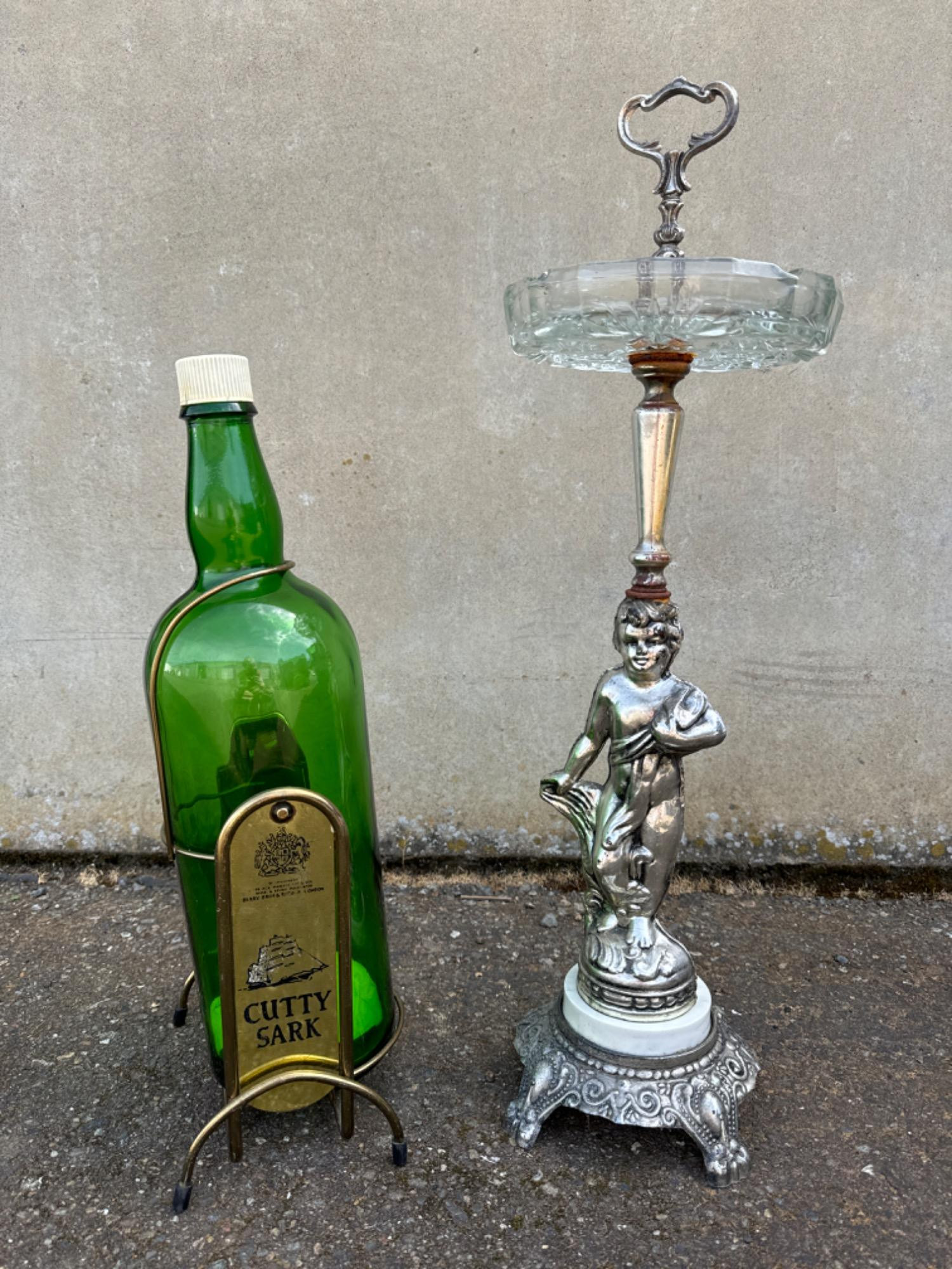 Standing Ashtray - Plastic Cherub & Metal Base Glass ashtray - has rust - 26"T Cutty Sark Whiskey Bottle in Stand - 19"T total - missing one rubber foot.