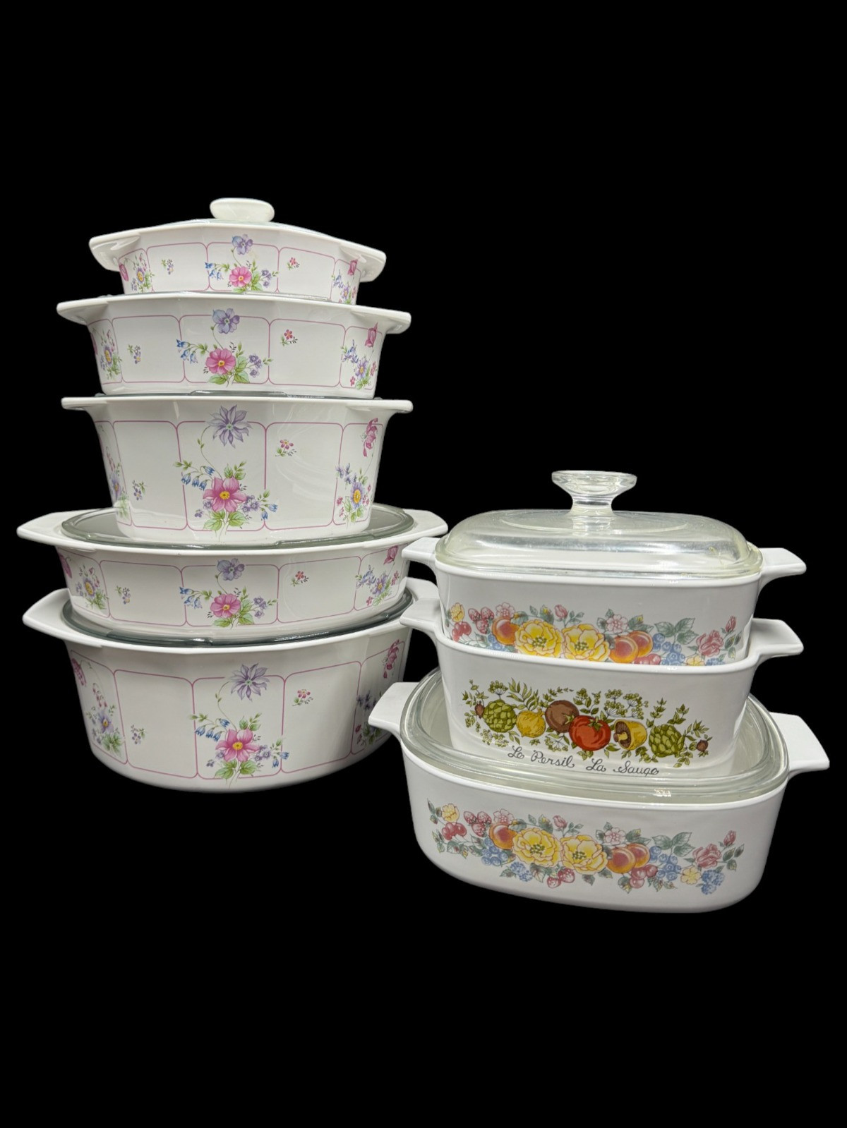 5 Narumi Japan ceramic stove top dishes/pans Largest 10"D Smallest 6.5"D Majority in excellent condition, some utensil marks on the shorter pans. All have lids Matching Corningware Orchard Rose 1.5 quart and 2 L w/lids 1.5 qt Spice of Life - no lid Corningware are all in great condition. Need cleaning.