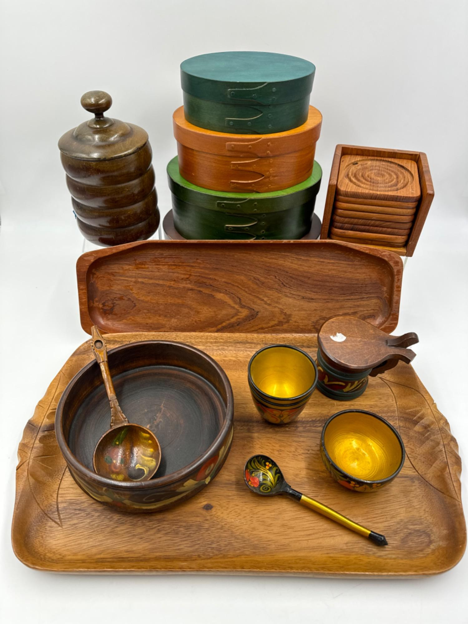 Vintage Wood Home Goods - Scandi Humidor - Teak - Lacquer Folk Art Largest measures: 18.25” x 11” Smallest measures: 1.25”T x 3”D Scandi humidor has crack in wood, Designmark tray has wear to lacquer finish, & crack in teak wood coaster holder