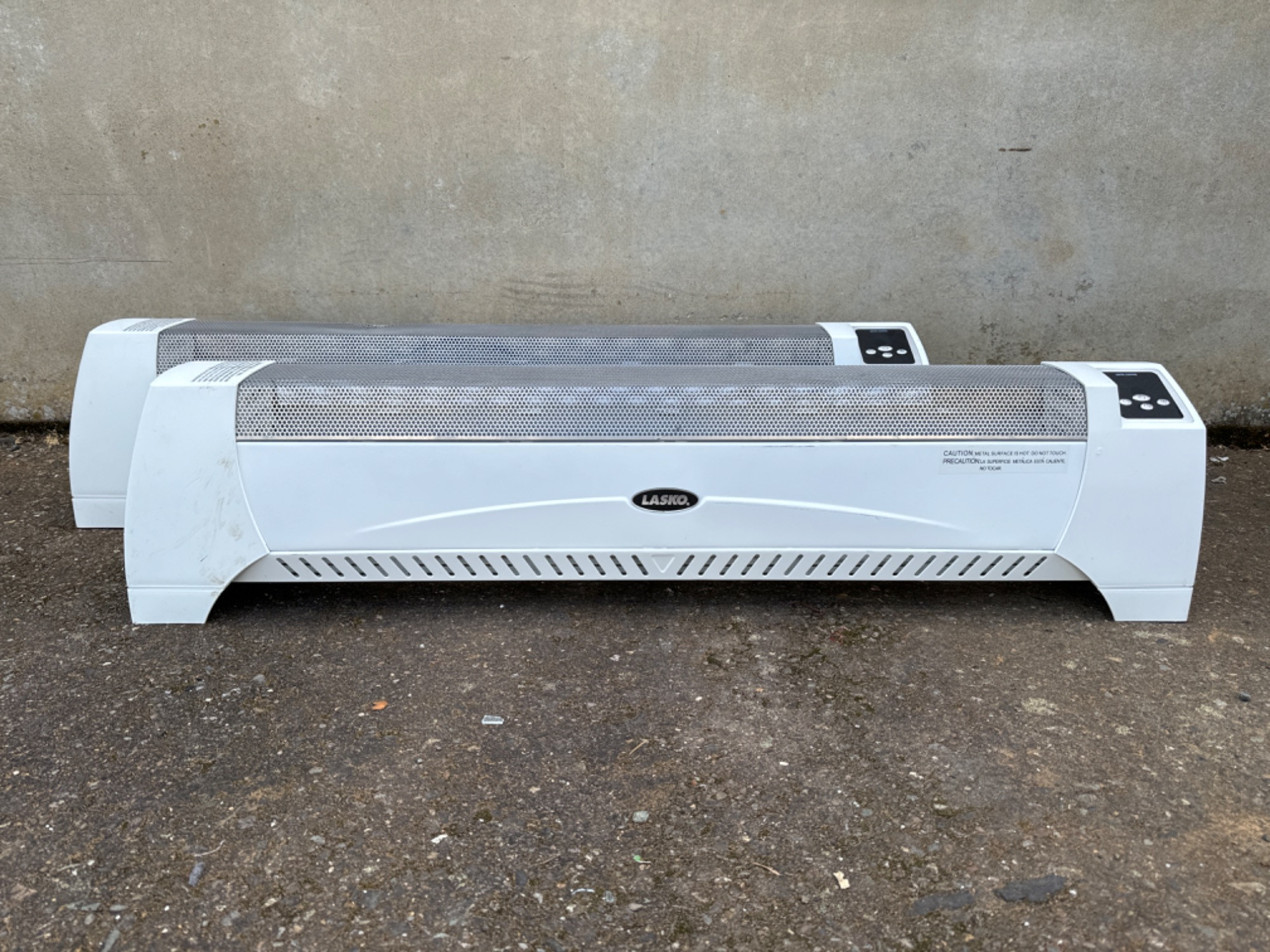 Lasko Low Profile 1500-Watt Electric Silent Room Space Heaters with Digital Display and Tip-Over Safety Switch Model 5622 Measures: 39.25”L Second heater has dent on back corner Both tested, work.