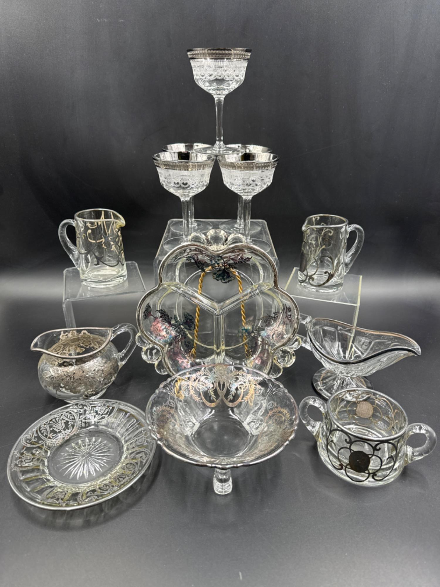Mostly Heisey Glass pieces w/Sterling Overlay - 3 unmarked (5) Platinum Ring & Etched Stemware coup glasses - 4.25"T Widest item: 7.5"D 5.25" Sterling Heisey plate Floral small creamer is missing a good amount of the finish.