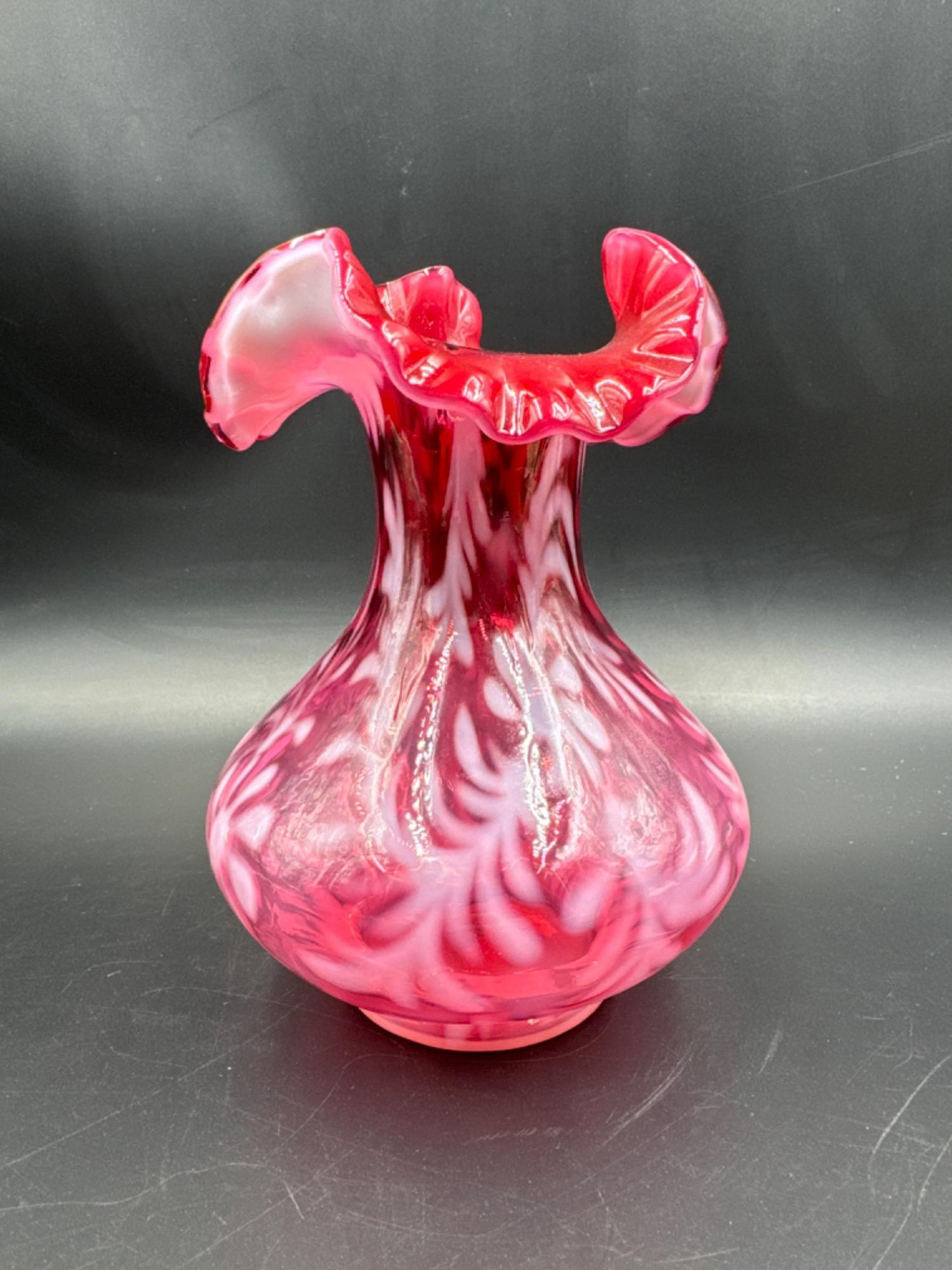 Fenton 7" Cranberry Opalescent Fern & Daisy Vase Has sticker. Excellent condition!