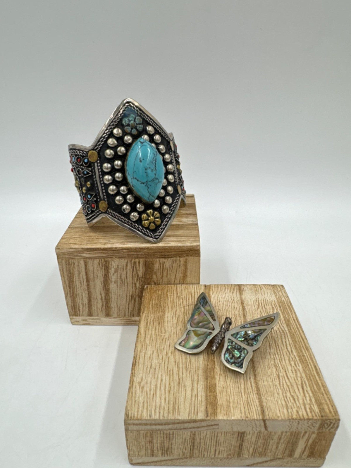 Vintage Sterling Cuff Bracelet - possibly of Uzbek/Turkish origin - unmarked Tallest part 3.25"T Mexican Silver Abalone Butterfly Pin - 1.5"