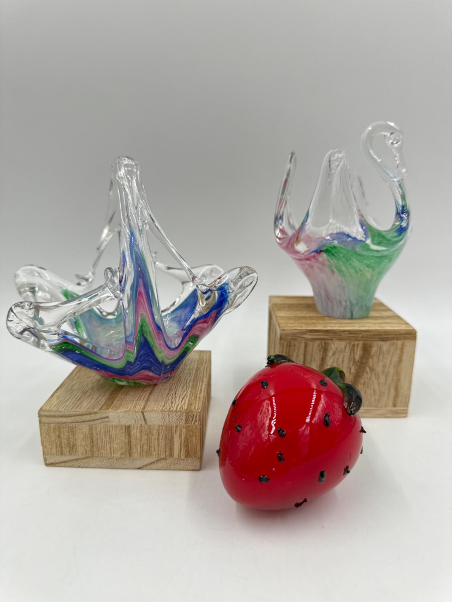 Murano Pink, Blue & Green Stretch Art Glass Basket & Swan + Strawberry 5” basket 5” swan 4” strawberry - unknown maker All are in great condition
