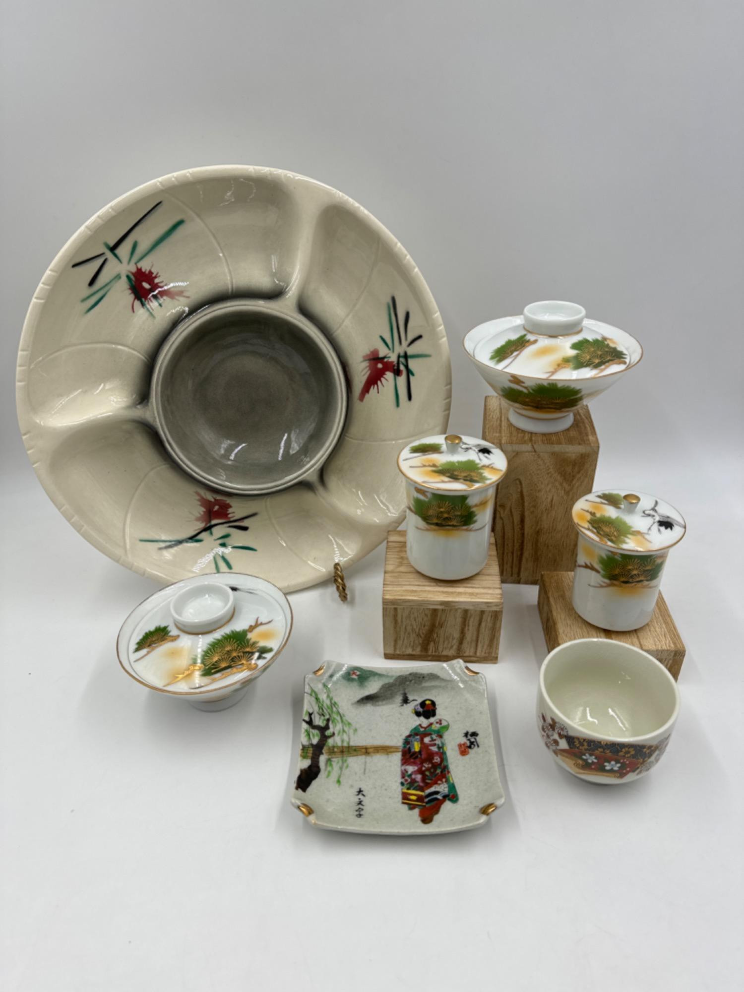 Vintage 8 piece Japanese Couple's Lidded Cups & Bowls Each set has a smaller and larger piece - excellent condition Van Nuys Lane & Co CA Pottery 3060 divided ceramic dish - 12"D and more Everything is in great condition