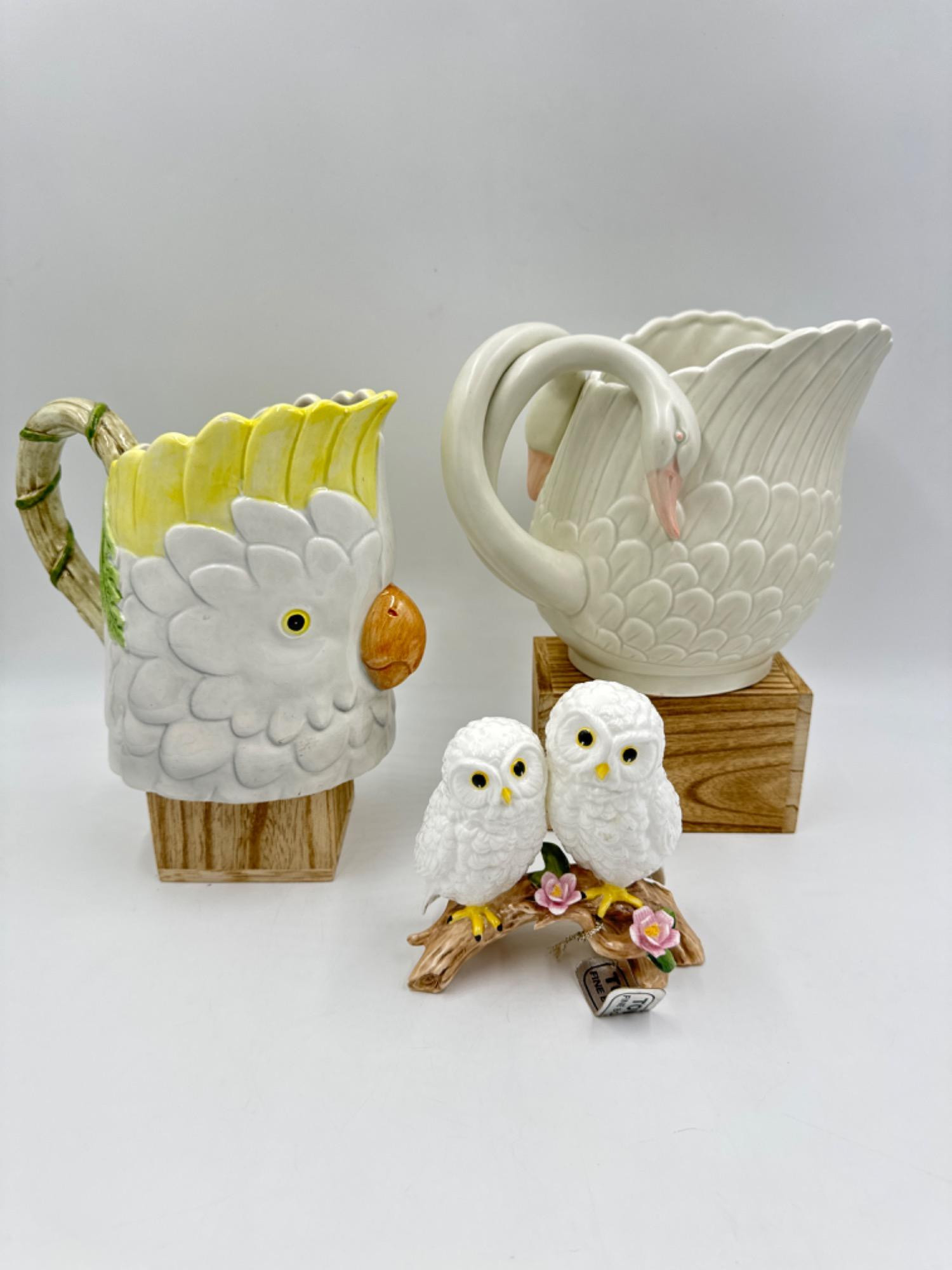 Towel Owl Pair with tag - 5”T 1984 Fitz & Floyd Cockatoo Pitcher - 6.5”T - has flea bites to rim 1981 Fitz & Floyd Swan Pitcher - 6”T