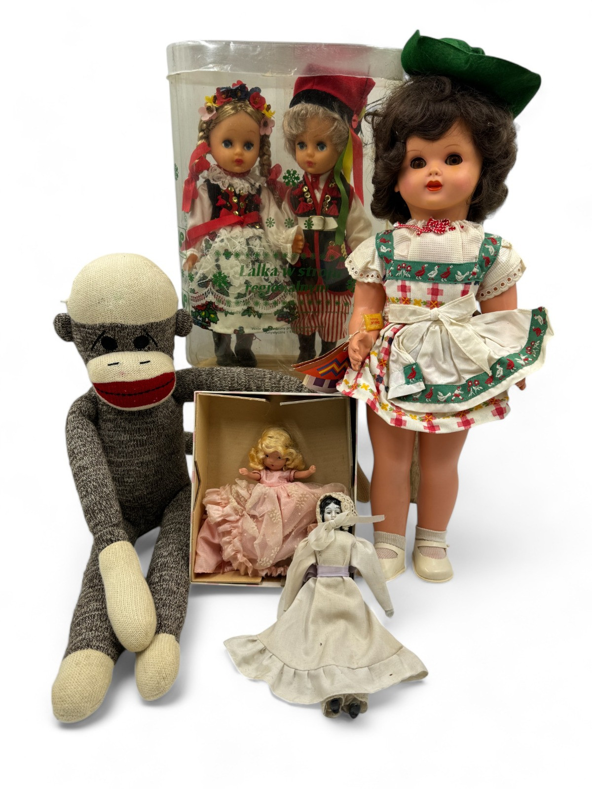19”T Three M - Mrs. E. Martha Maar doll - marked 450/35/10 on neck. No longer cries "mama" German porcelain style doll New in Box Polish Dolls Nancy Ann Storybook Dolls Cinderella Went to the Ball in original box - 6” Sock monkey needs repairs