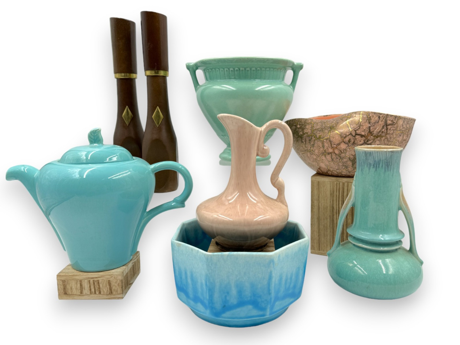 Salt Shaker & Pepper Grinder Wood Brass - 11”T Ceramic items measure between 3.5-7.5"T Rumrill 6”T x 7.25” handle to handle Blue drip glaze J17 planter Roseville Pottery Orian Turquoise Vase - has a chip on decorative loop Pink & Gold bowl is chipped Teapot has repair on underside of spout