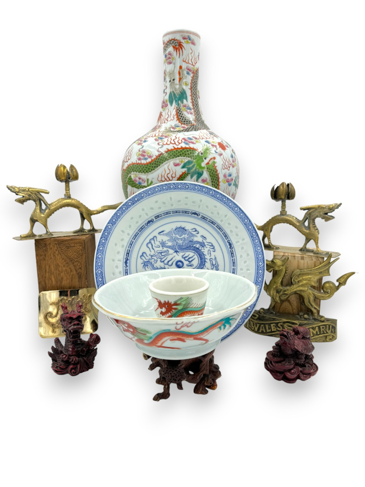 13"T x approximately 8"D Vase Rice Grain plate 10"D Red Dragon Ware matching cup & 7.25"D bowl 1982 Welsh Dragon Brass tone Dragon & Lotus Candle Holders and more!