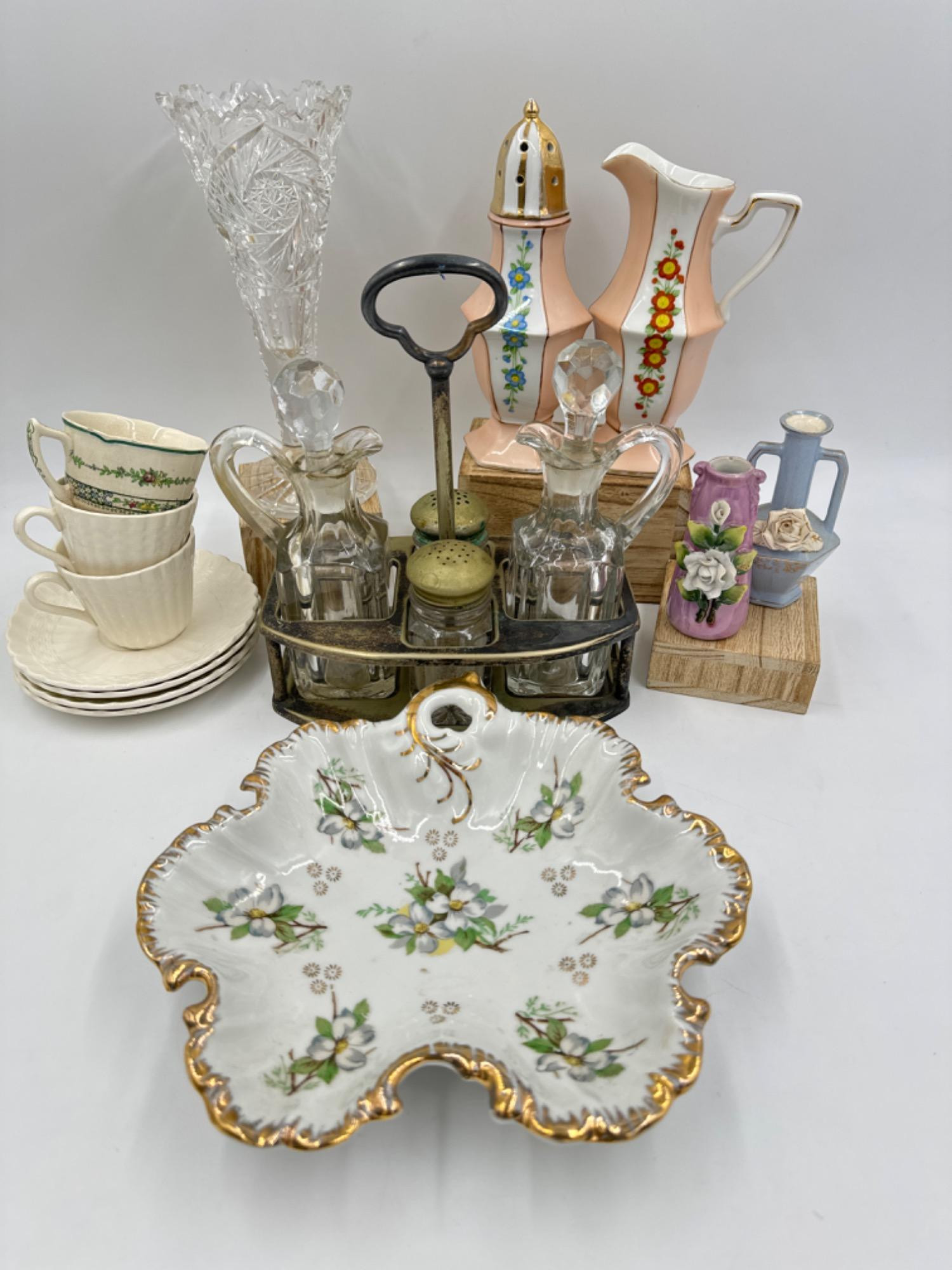 Antique & Vintage Servingware Antique Rogers Condiment Set - 8.5"T x 8.5"W handle to handle - needs cleaning Cut crystal whirling star vase w/ sawtooth edge - no noted flaws 7.75"T Spode Copeland and Royal Doulton Rd no 594902 Demitasse Cups & Saucers Noritake sugar shaker is 7"T