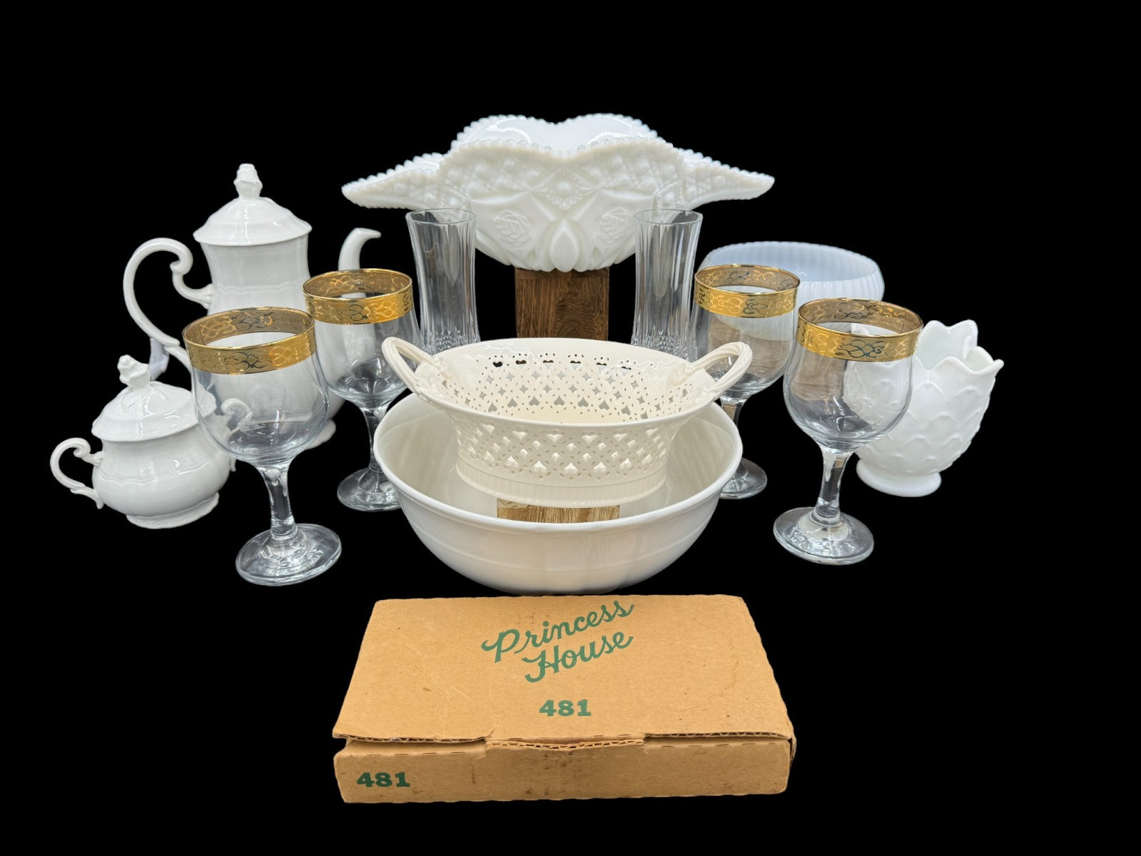 New in box Princess House Crystal Coasters Four gold rimmed wine glasses - 6.75"T Several Alhambra Arita by Santa Clara - Ironstone, Spain pieces 9.5"D bowl Teapot & Sugar bowl **Largest piece has damage to the edge, lid is chipped, and the bottom has swirl pattern of crazing - See last 3 photos** Not included in the main image Vintage White Artichoke Vase Napoleon Hat Milk Glass Centerpiece - minor tooth damage Leeds Pottery pierced creamware
