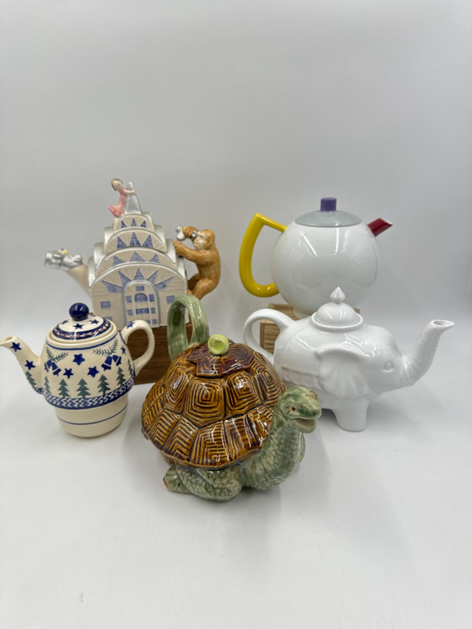 Quirky Teapots 1987 Omnibus King Kong Post Mod Lutz Rabold for Arzberg "City Modern" Largest, Turtle 10"L Smallest, Polish pottery 6"T x 6.5"L All are in great condition with no issues.