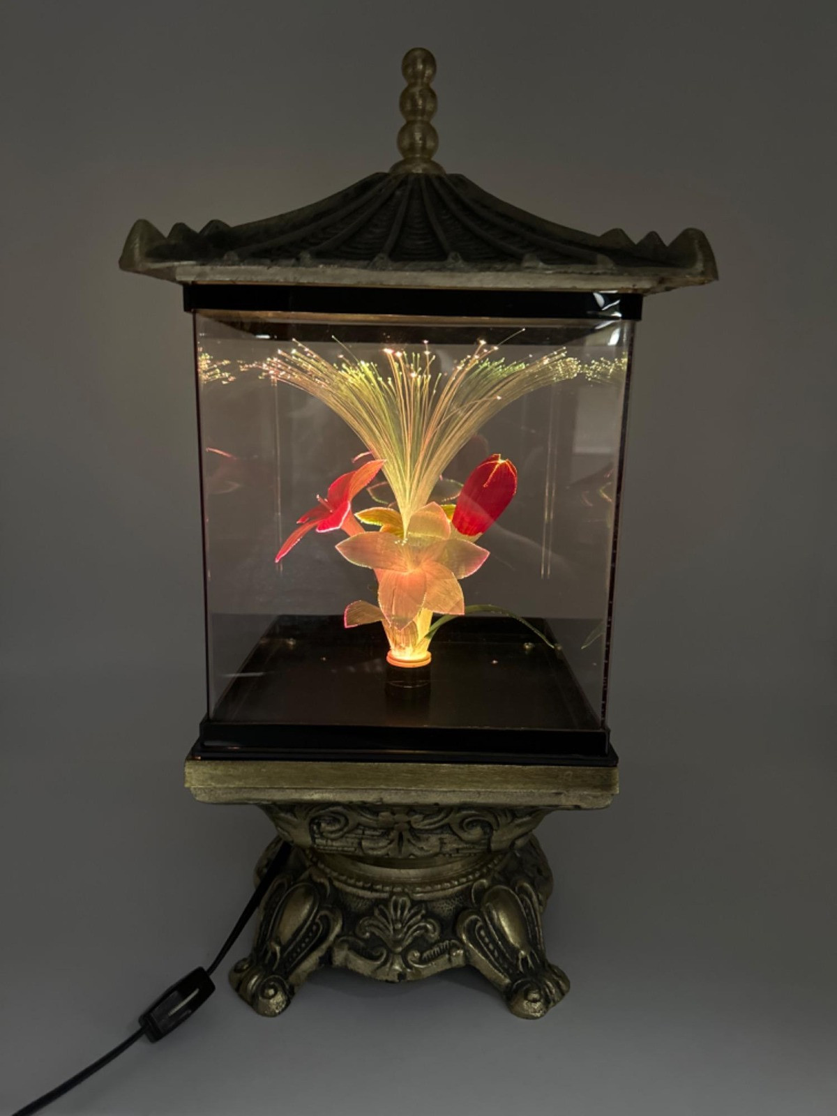 Vintage Fiber Optic Pagoda Lamp Lid measures: 8.75 x 8.75 18"T Plexiglass sides Works great!