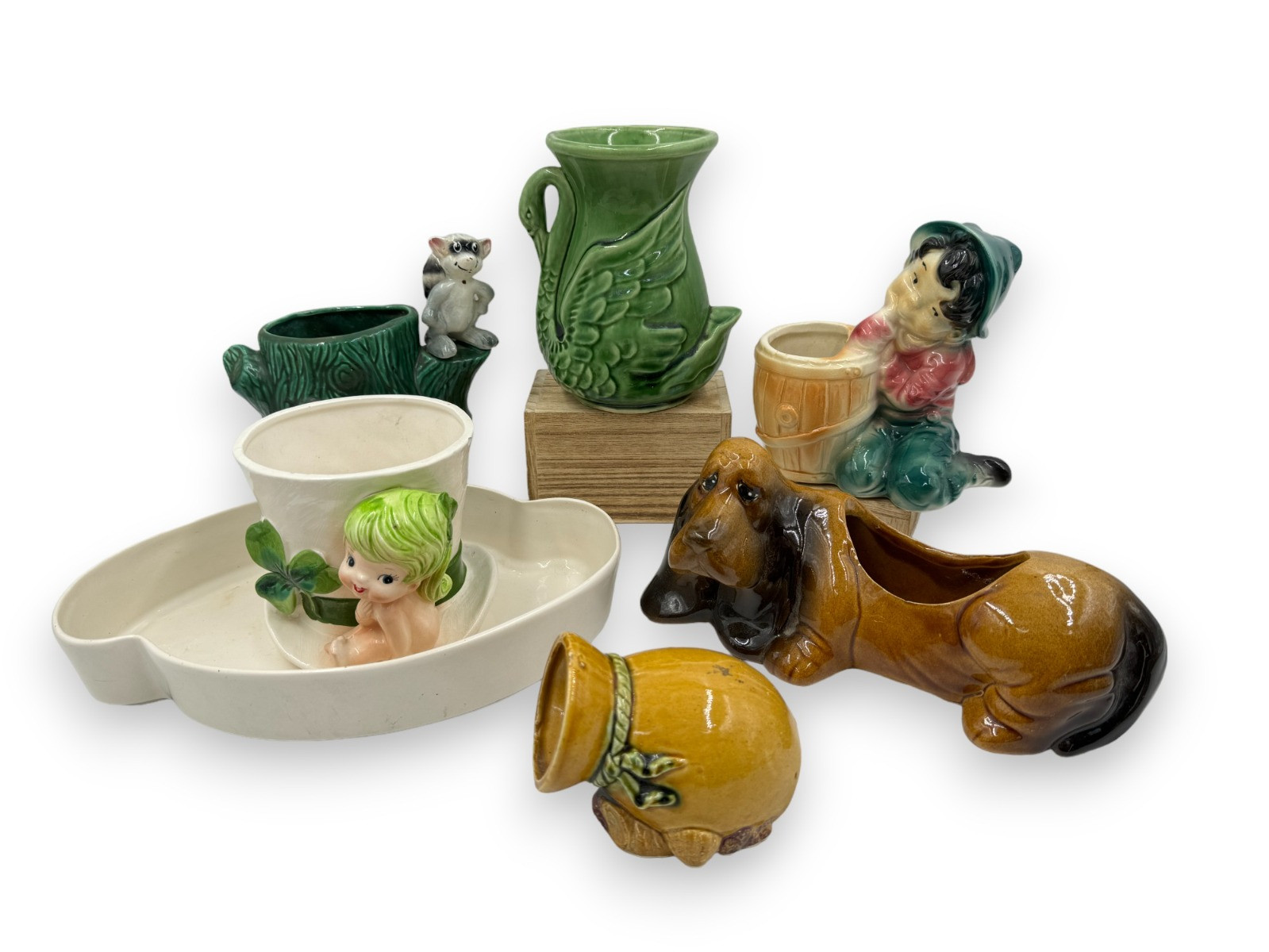Mid Century Kitschy Ceramic Jardinieres Majority have some sort of minor flaw. Swan Vase 6"T - has been repaired Basset Hound dog planter 9.5"L Pacific 3608 tray - 10.75"L