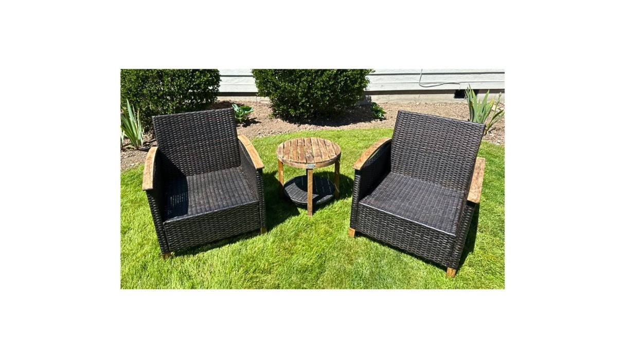 Outdoor Woven Chairs w/ Side Table by Patio Joy Chairs- 30" H x 26" W, 13" from ground to seat Table- 19" W x 19" H *gently used condition