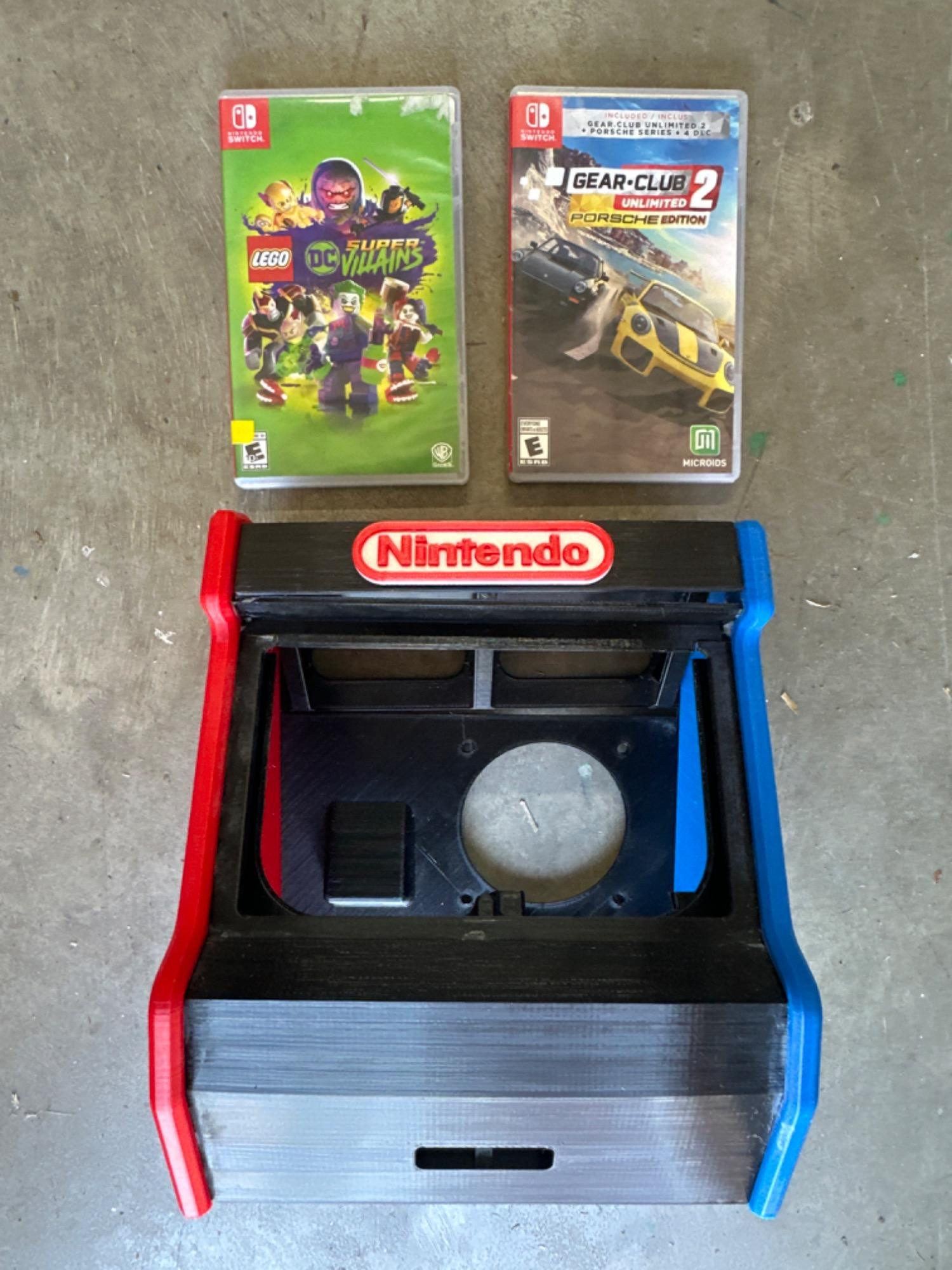 Nintendo switch retro arcade style holder measures 8 inches wide 9 1/2 inches tall holds Nintendo switches that have removable controllers Nintendo switch games