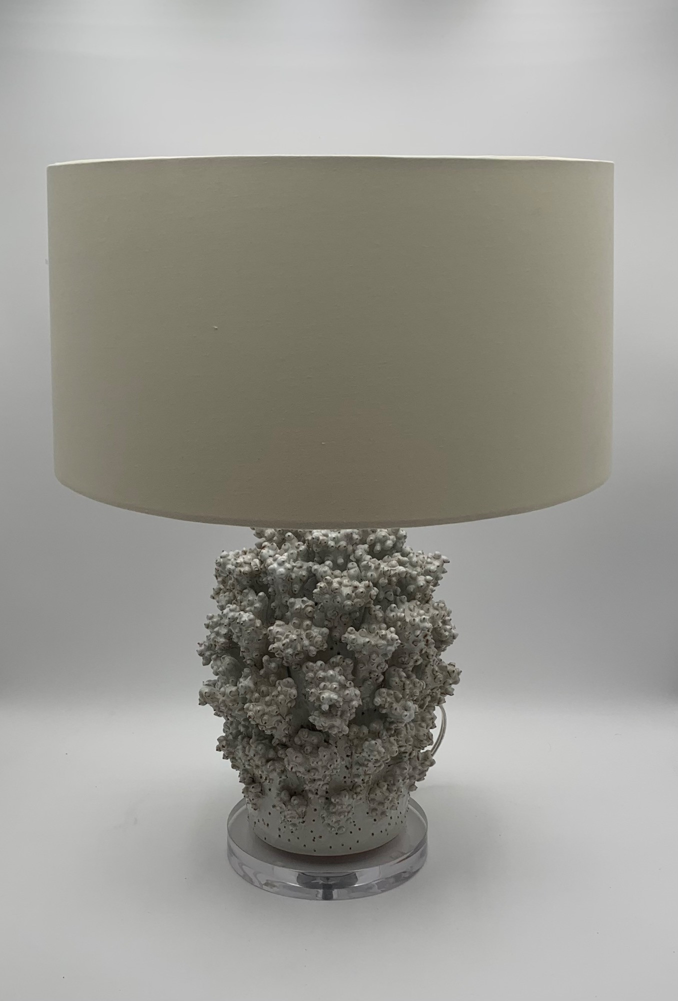 Really gorgeous table lamp with coral-like texture in white ceramic. Very pretty and able to blend with any type of decor because of its unique appearance. Comes with round off-white barrel shade. Has a Lucite base and a 6" cord with an on/off switch. Please note - the lamp is in working condition and looks great, but the base/bulb rings are slightly askew - see last picture. This could easily & cheaply be corrected with a quick switch out of socket mount. Measures 21.5" H with shade. Shade measures 17" W. LOCAL PICKUP ONLY ON THIS ITEM