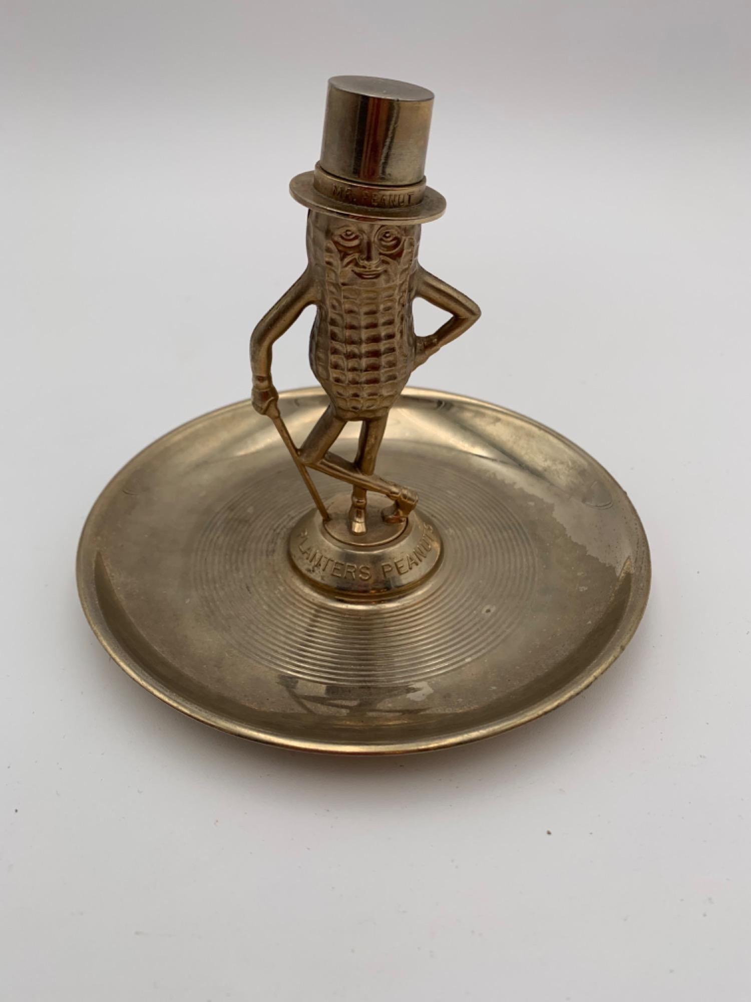 Wonderful vintage Mr. Peanut metal serving tray from Planter's Peanuts celebrating their 50th anniversary in 1956. Client's grandfather ran a tobacco & candy distributorship in Kansas in the 1950s and would receive items like this depending upon volume of units sold. In wonderful shape. Made by Diecasters, Inc. of Ridgefield NJ. Love the detail including the monocle! Cork bottom. Measures 4.5" H x shy 6" W.
