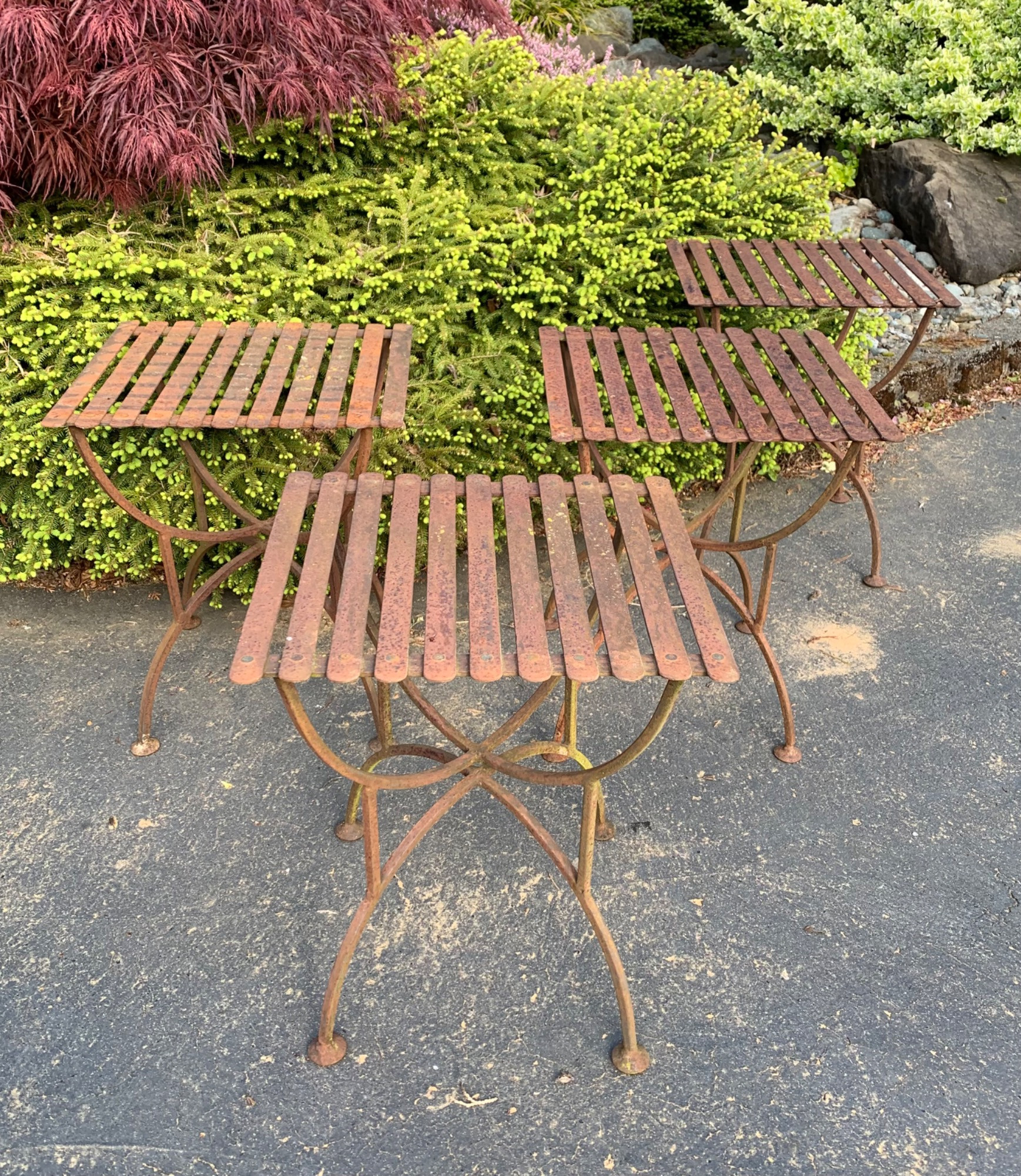 Set of 4 heavy iron plant stands.. Not your usual ugly garden stand! Graceful curves, slatted tops, and convex feet. Super sturdy with welded joints; can hold the heaviest of your garden pots. Terrific weathered patina from Seattle rain and Alaska snow - these are about 30 years old and as sturdy as the day they were purchased. Can be stacked for storage. Measure 18.5" H x just over 15" W x 14.25" D. More iron plant stands in Lot #2. LOCAL PICKUP ONLY ON THESE ITEMS