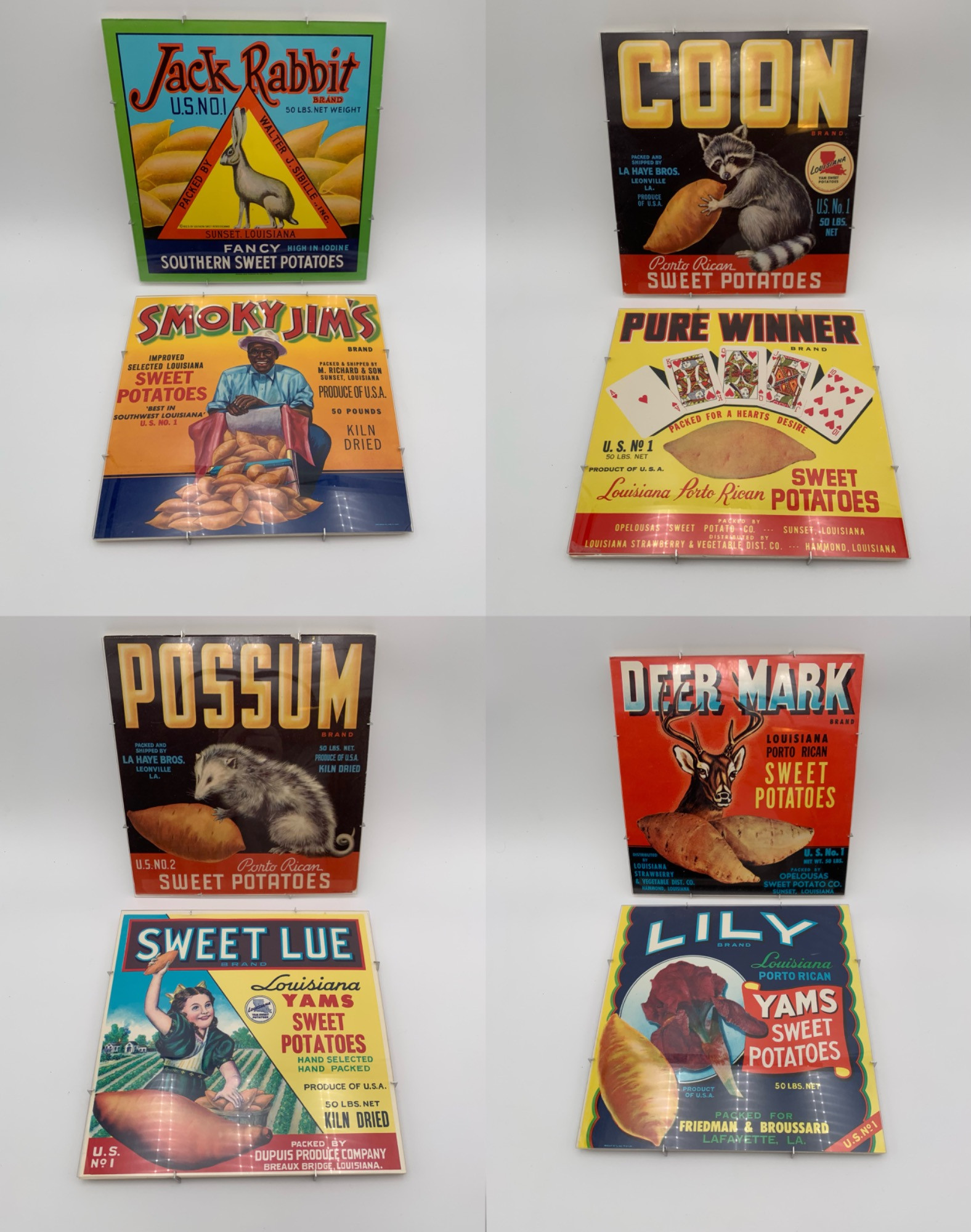 8 Plexi-framed vintage sweet potato 50 lb. crate labels; most from Louisiana. These labels have great graphics and deliver a punch of color when hung in succession as a gallery wall. They are in simple tension-frame Plexi squares and measure 9" square. Great funky found art.