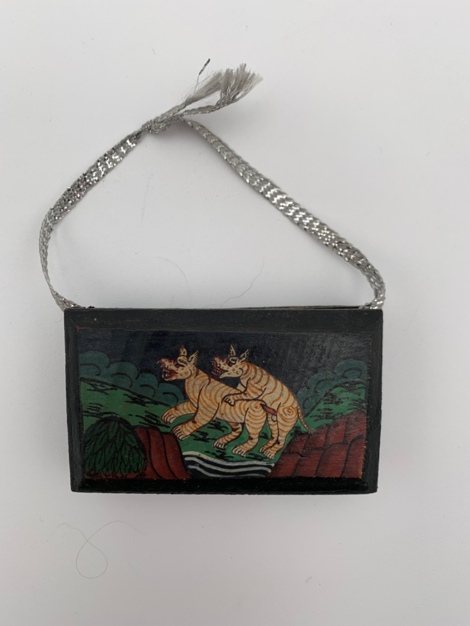 Handmade accordion book portraying animals in the act. Front cover and back cover are carved wood painted black while pages are heavy black tag-like paper with gold writing. Back of pages have no pictures - just writing. 12 species of animal portrayed including cover & back. At least 30 years old if not more. Measures just 1" H x 3.5" W x 2" D. Note that there are 2 rips in the tag-paper where the pages fold - see last two photos. We chose not to repair them - we will let the new owner leave as is or correct according to preference.