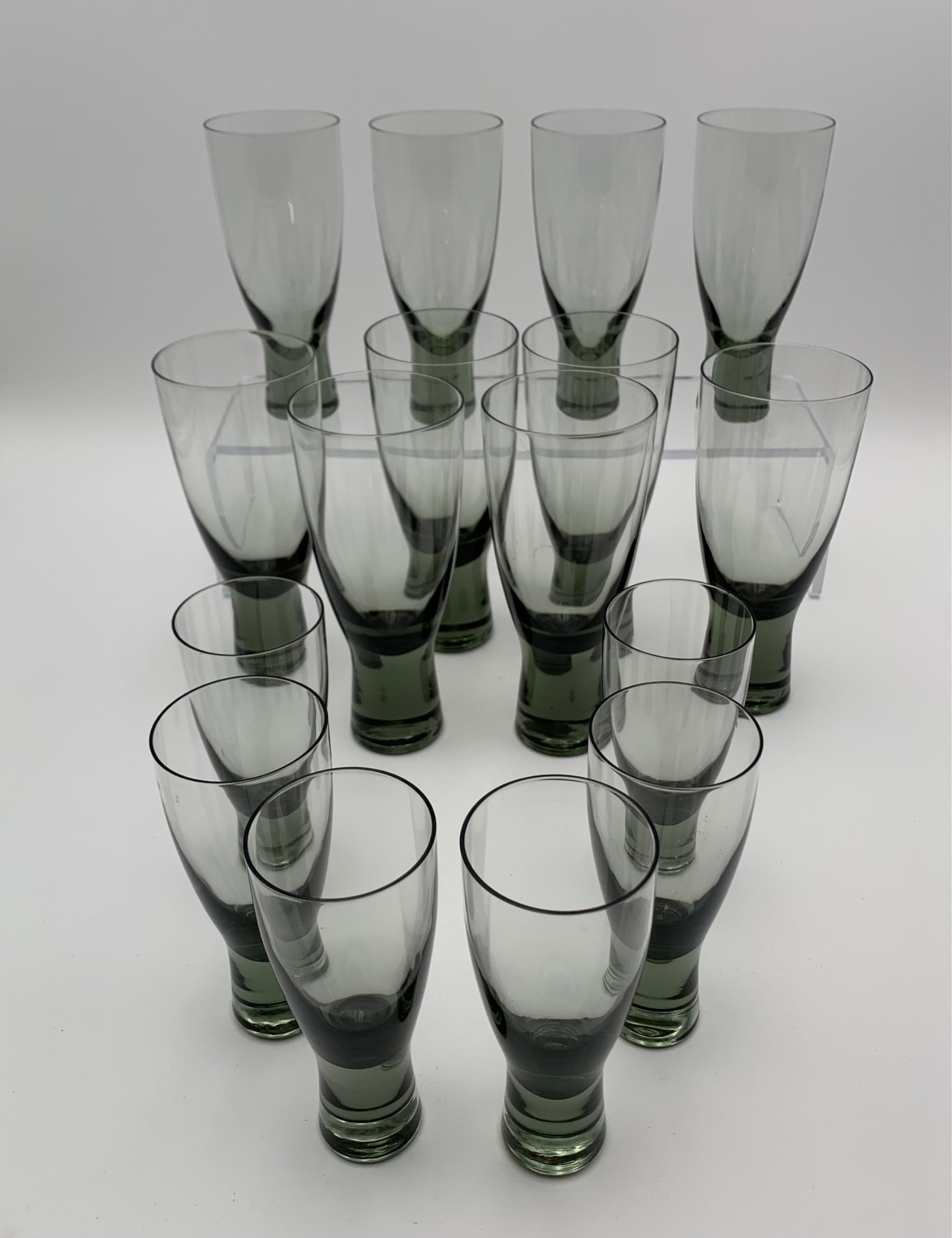 We believe these16 glasses may be from MCM glass manufacturer Holmgaard in the "Canada" design. If they are not, they are a very good period copy! These vary slightly as they appear to be handblown. In grey-green smoke color. Incredibly graceful, they are also amazingly stable for their shape with a heavy weight base. All are in good shape, although a couple have an odd scratch or two (but not noticeable until we started doing lots of closeups - see last photo for the most noticeable in certain light.). Some appear to have a makers mark, but we cannot decipher/read. Small glasses (6 count) measure 5.5" H x 2.25" W Medium glasses (4 count) measure 6.25" H x 2.75" W Large glasses (6 count) measure 7" H x 3" W Same glasses - we think - on another site: https://www.etsy.com/listing/1346215257/kastrup-holmegaard-scanada-canada-steel?click_key=1ed819307de1328f70f2a9d04ea7adc9c1666171%3A1346215257&click_sum=9b79280d&external=1&rec_type=cs&ref=pla_similar_listing_top-3&sts=1