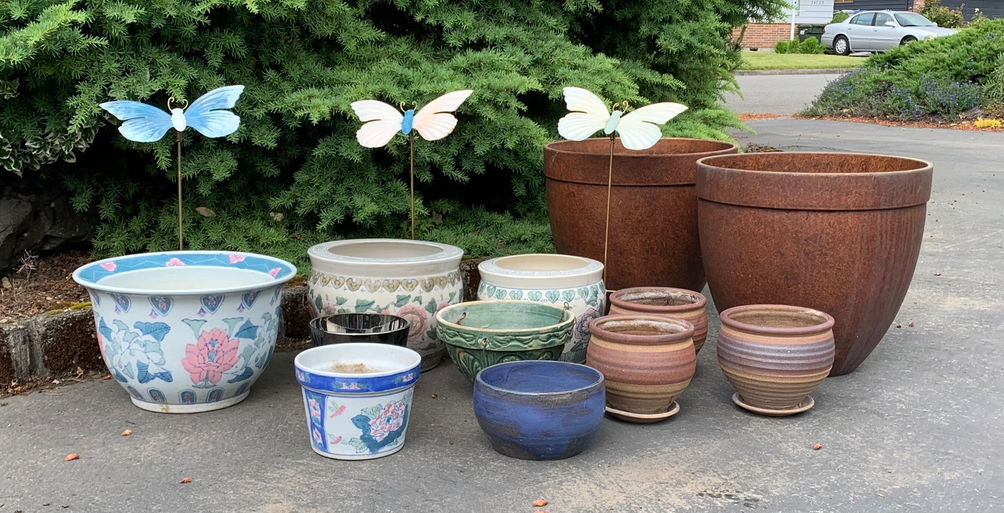 12 garden pots/planters of various shapes, sizes, and materials for all your garden needs. 2 large brown plastic pots measuring approximately 13" H x 14.5" W. 2 matching white Asian-style ceramic pots with Greek key design along rim and pink/green/blue floral decoration. Larger of the two measures 8" H x 10" W. 3 brown earthenware planters approximately 5.5" H x 5" W with stabilizer plate below. 1 green hanging ceramic planter with raised designs. Measures 5" H x by just over 8" W. 1 blue ceramic planter measures 4" H x 7" W. 1 black ceramic planter measures 5" H x 6" W. 2 additional Asian-style planters - the larger measures just under 8" H x just over 12" W.. 3 decorative butterfly stands with removable bases measure approx. 17" H. LOCAL PICKUP ONLY ON THESE ITEMS